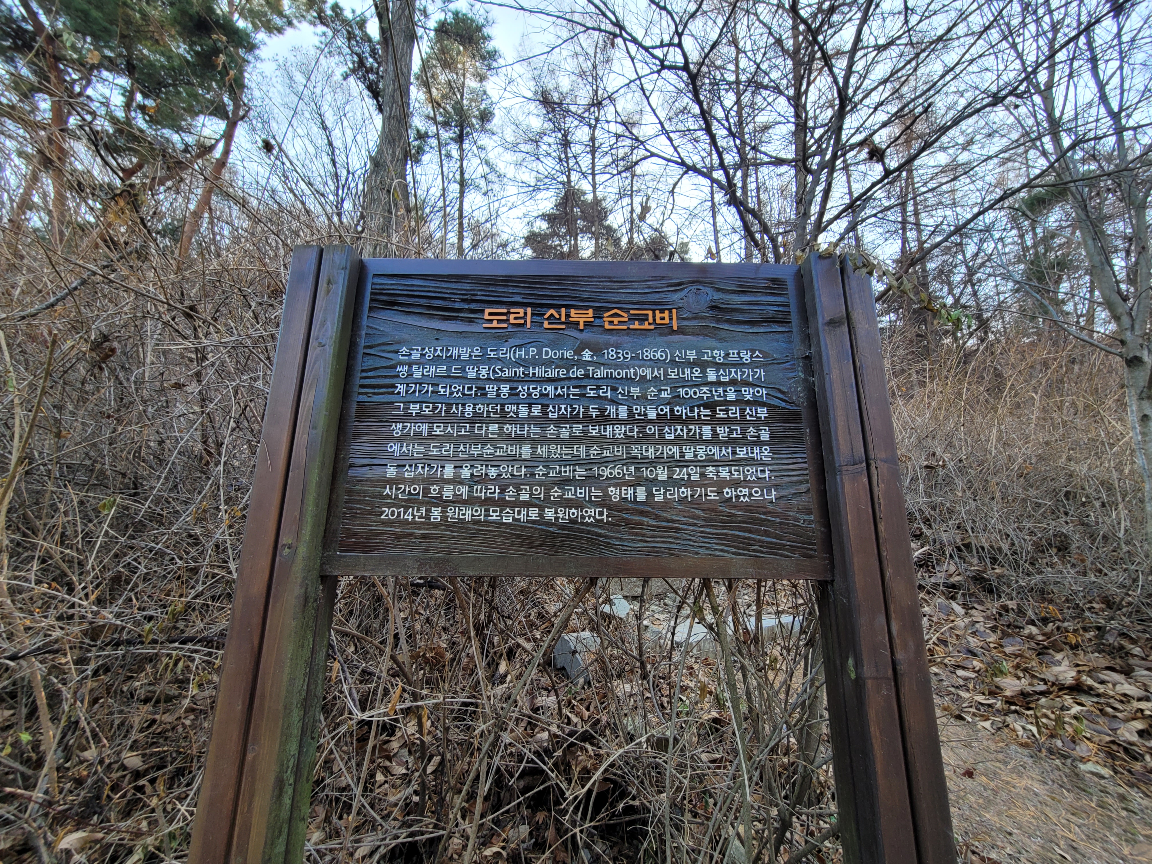 순교비는 1966년 10월 24일 축복되었다고 합니다. 시간이 흐름에 따라 손골의 순교비는 형태를 달리하기도 했지만, 2014년 봄 원래의 모습대로 복원하였습니다. 프랑스에서 그 머나먼 조선까지 와서 천주교 박해로 순교한 도리 신부의 명복을 빕니다.
