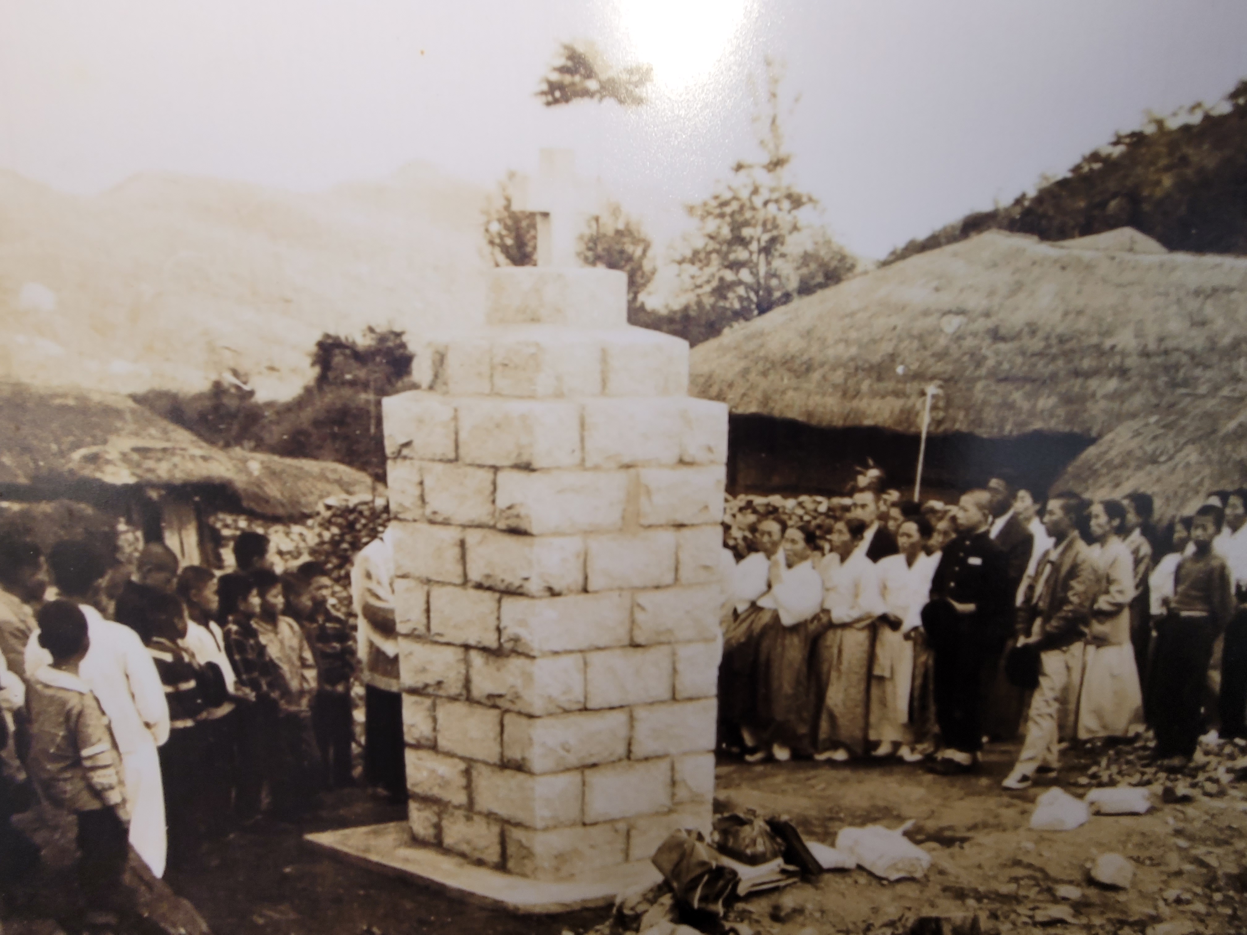 이 십자가를 받고 손골에서는 도리 신부 순교비를 세웠는데요, 순교비 꼭대기에 딸몽에서 보내온 돌 십자가를 올려놓았습니다. 앞서 소개해 드렸던 손골기념관에서 보니 당시 돌 십자가를 세우던 흑백 사진이 있습니다.