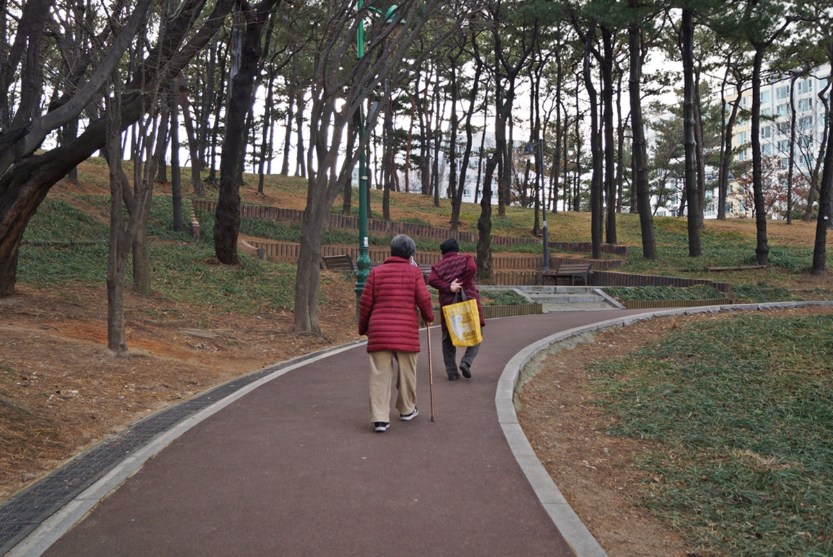 이제 사계절 푸르른 소나무 숲이 우거진 곳으로 가볼까요? 동네 주민들이 오르막길을 걸으며 산책을 하고 있습니다. 산책길은 마닐라 삼으로 포장된 푹신푹신한 길도 있기 때문에 어르신들이나 아이들이 걷기에 부담이 없게 만들었습니다.