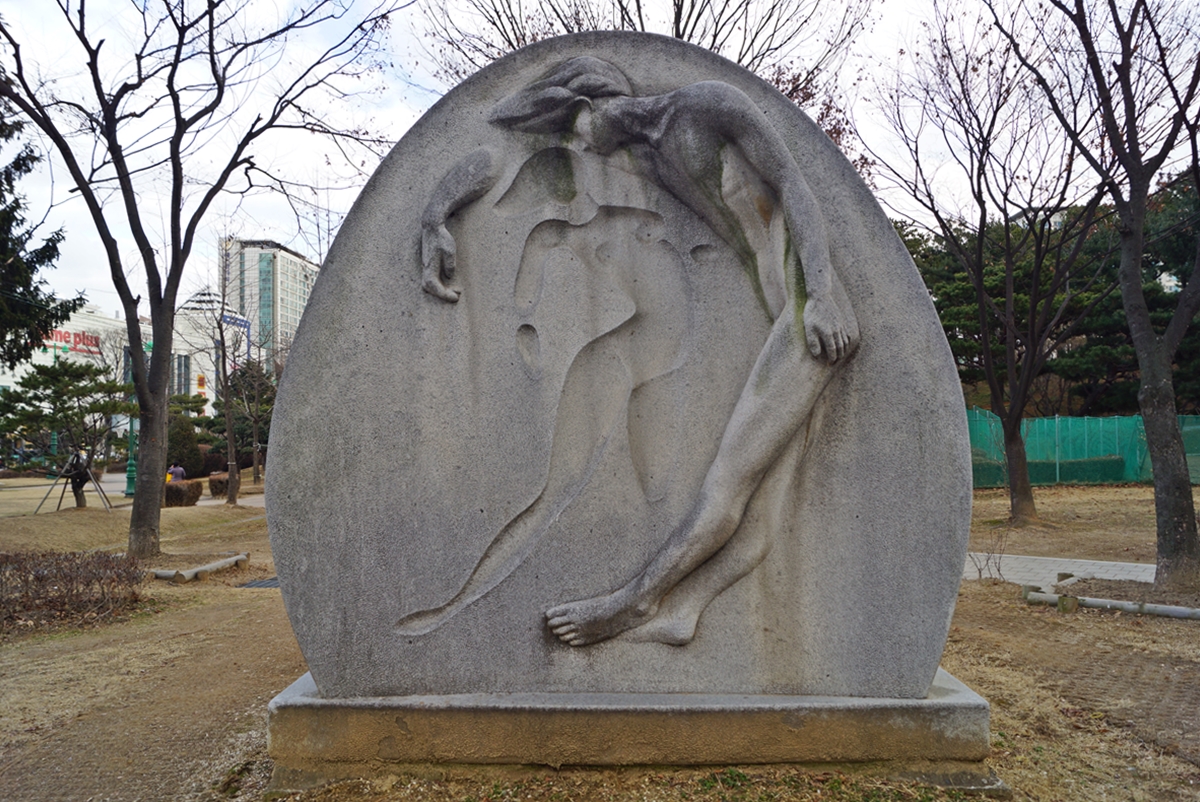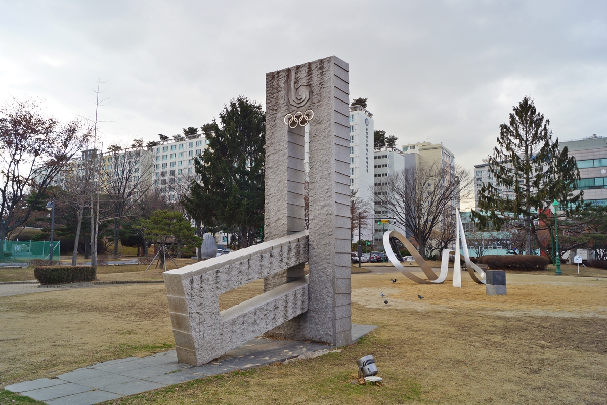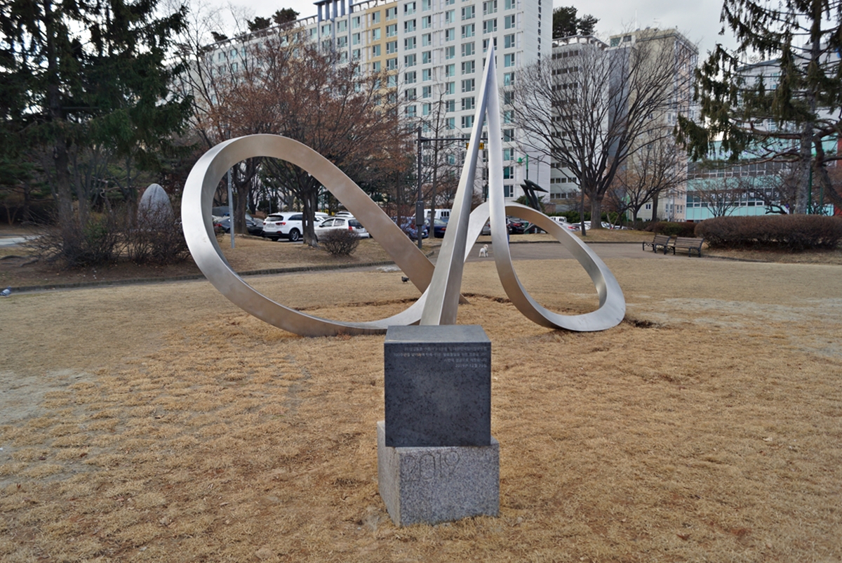 올림픽공원은 예술작품 같은 조각 작품이 많습니다. 총 16점이나 설치됐습니다. 마치 야외 갤러리 같습니다. 여기서 다 소개하지는 못하고 몇 개 작품만 소개하겠습니다. 이 조각작품을 보면 문이 생각나죠? 네 조각작품 제목이 '문(門)'입니다. 문은 바깥세상으로 통하는 출발점이죠. 수원시가 한국을 넘어 세계 속의 도시가 되기 위해 이 문을 열고 나가 5대양 6대주로 힘차게 뻗어나가길 기원합니다.