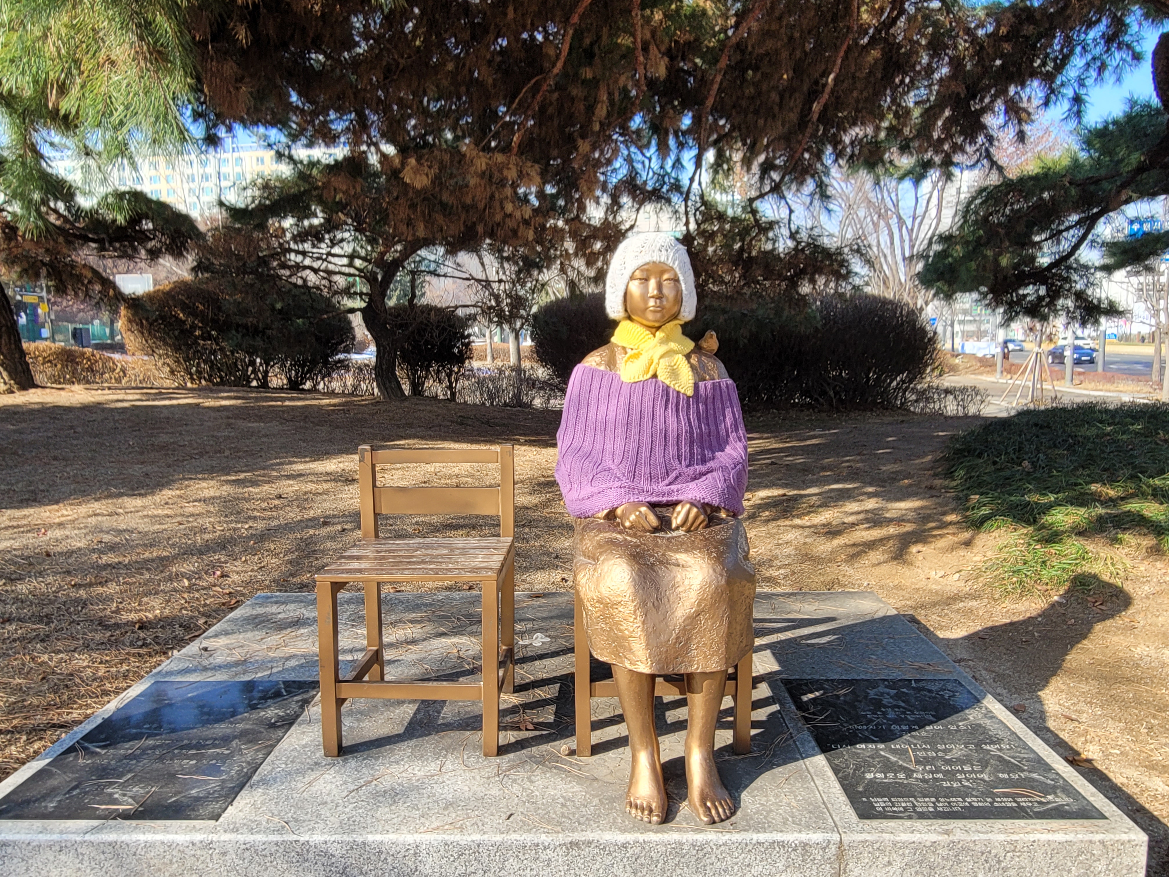 공원으로 들어서면 한복을 입은 '평화의 소녀상'이 눈에 확 들어옵니다. 일본 침략전쟁에 끌려가 '성노예'로 치욕을 겪은 소녀들의 삶과 아픈 역사를 기억하는 곳입니다. 그 위안부 피해자들의 명예 회복과 세상의 평화를 기원하는 수원시민의 뜻을 모아 2014년 5월에 세웠습니다. 평화의 소녀상은 수원 시민의 성금으로 건립한 겁니다. 한겨울에 춥지 말라고 빨간 목도리와 손 장갑을 끼워준 그 마음이 따뜻합니다.