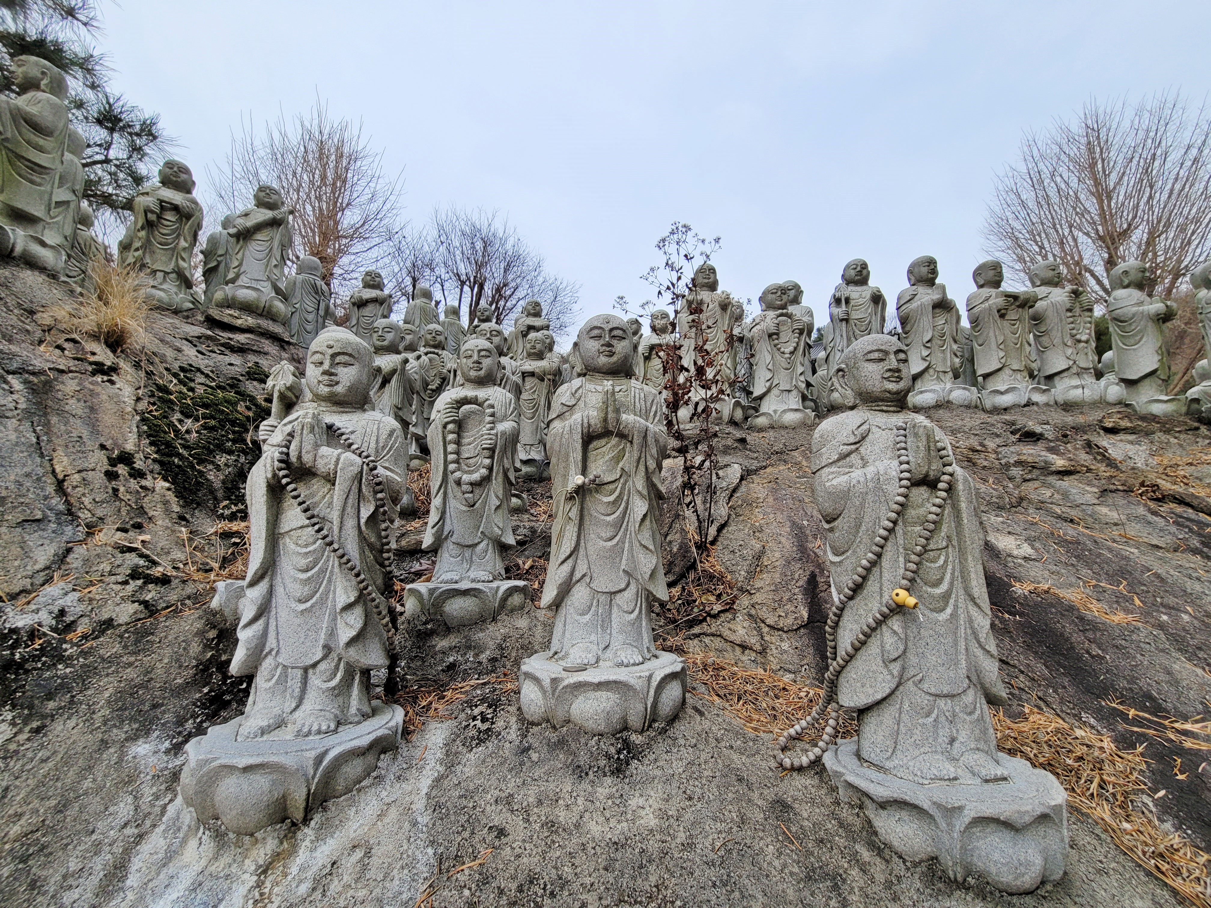 경내로 들어서면 큰 바위에 많은 부처님상이 반겨줍니다. 부처님상을 바위 위에 고정해 올려놓았는데요, 커다란 염주를 들고 중생을 위해 기원하고 있습니다. 맞은 편으로 가면 대형 부처님과 그 뒤로 작은 부처님이 빼곡하게 있습니다.