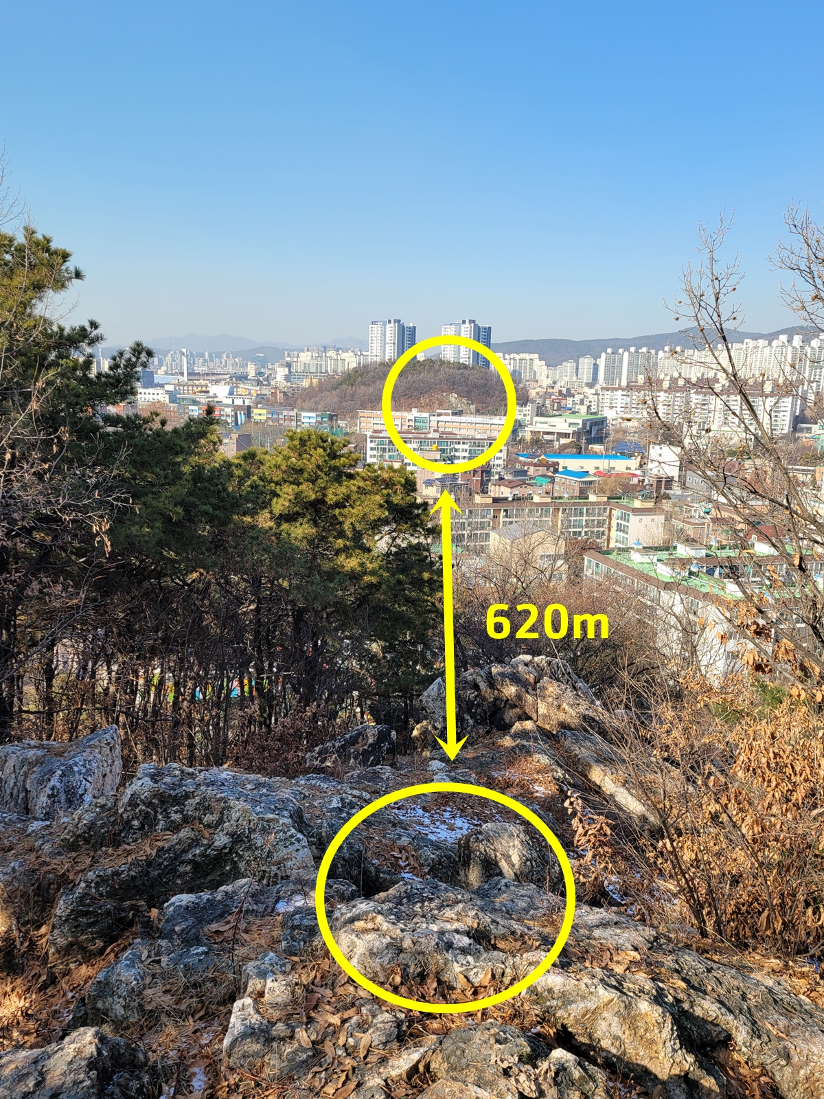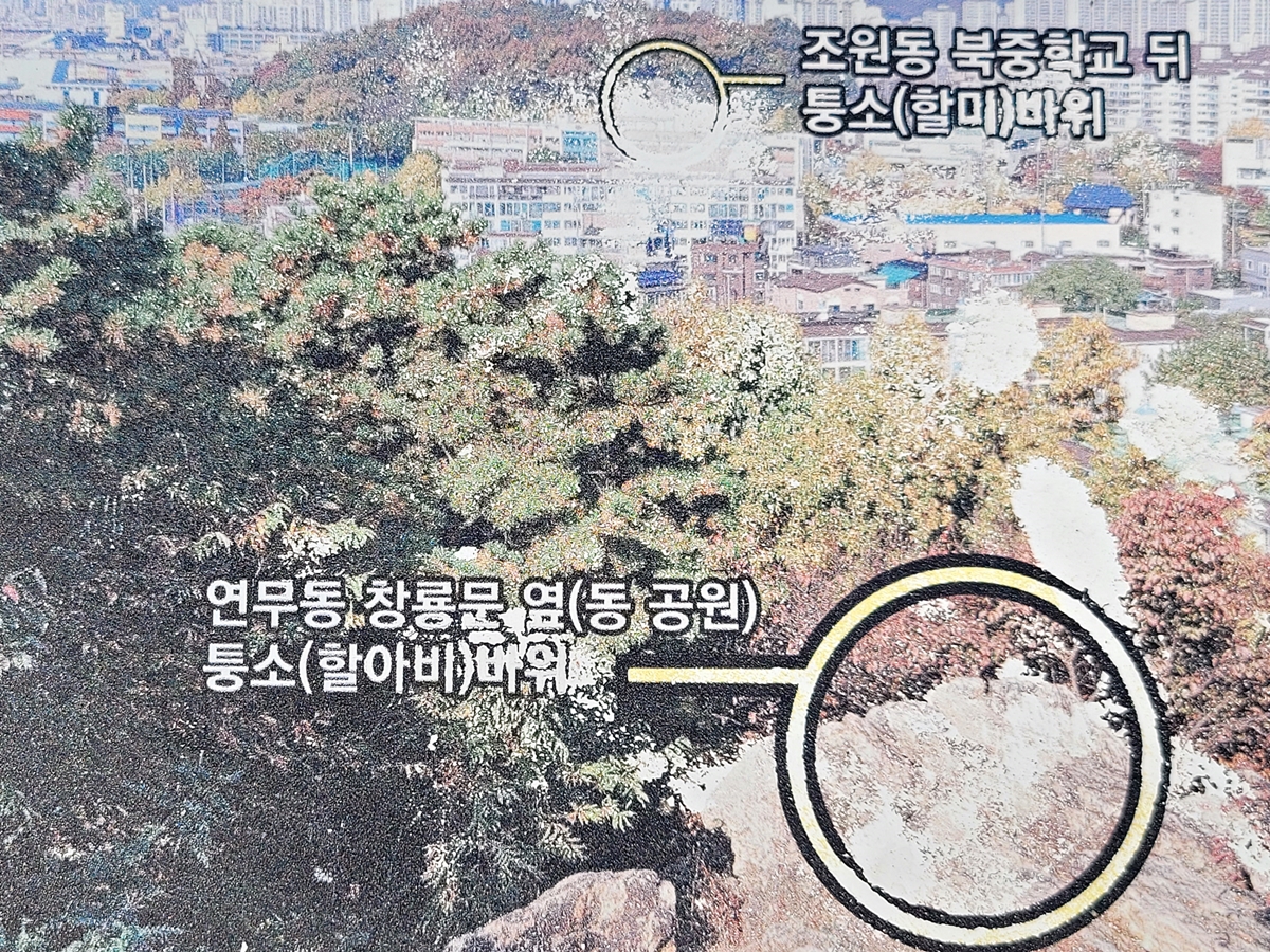 퉁소바위 전망대에서 보면, 안내판에 나온 대로 연무동 쪽에 할아비 퉁소바위가 있고요, 멀리 조원동 북중학교 뒤에는 할미 퉁소바위가 보입니다. 제가 네이버 지도에서 보니 할아비와 할미의 거리는 620m 정도입니다. 옛날에는 지금처럼 자동차 소음 등이 없어서 서로 퉁소를 불면 잘 들렸을 거리입니다.