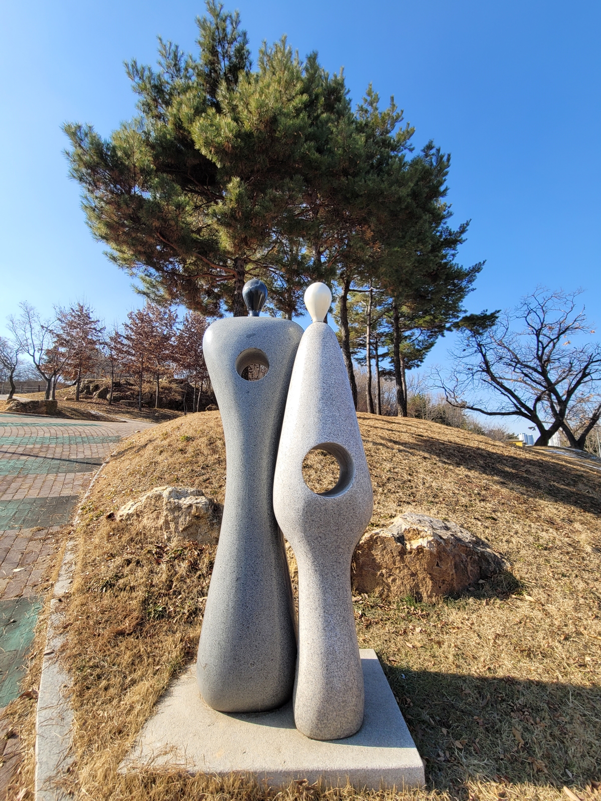 연무사회복지관으로 오르는 입구에 조형물이 하나 있습니다. 딱 봐도 부부의 모습이라는 생각이 들죠. 퉁소바위 전설의 주인공 할아비와 할미입니다. 애절한 사연을 알고 퉁소바위를 보고 내려와서 그런지 부부의 사연이 더 안타깝게 느껴졌습니다.