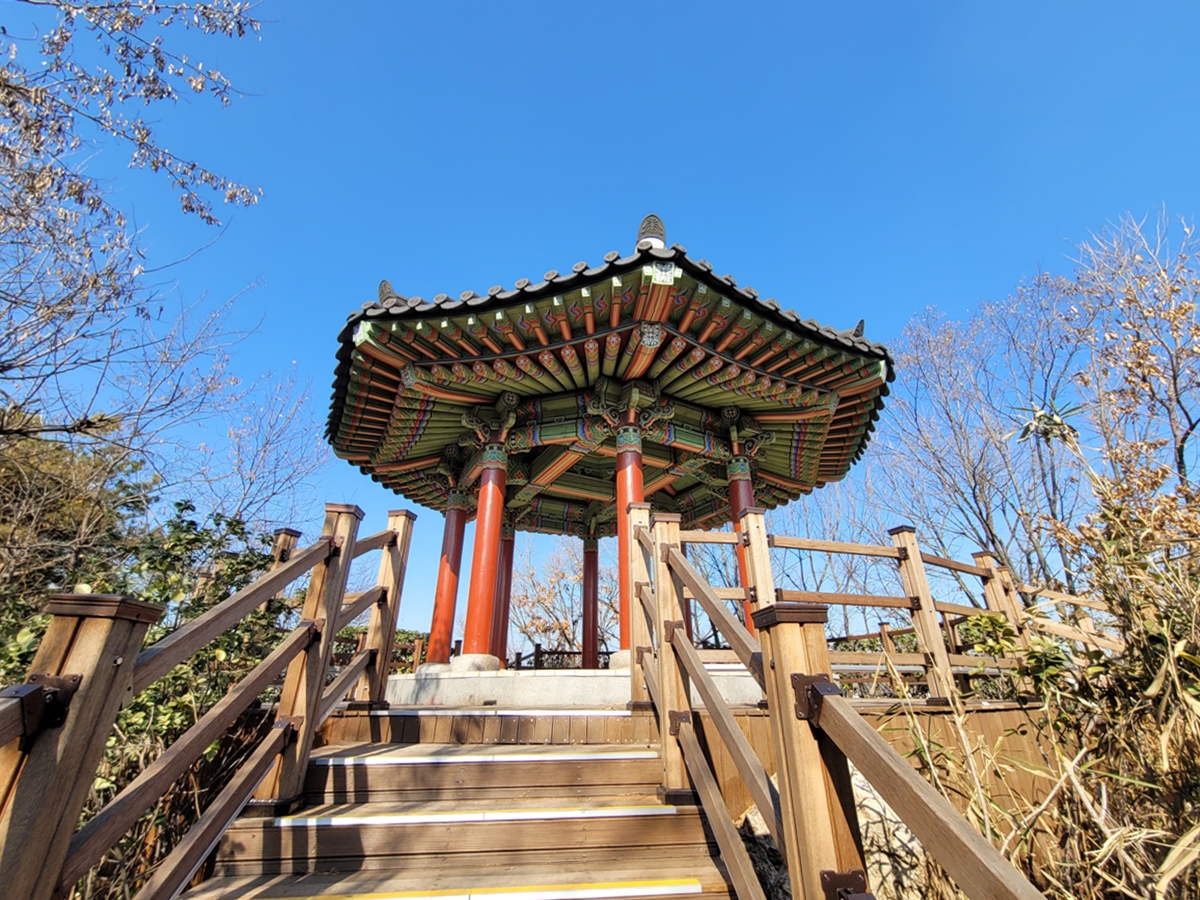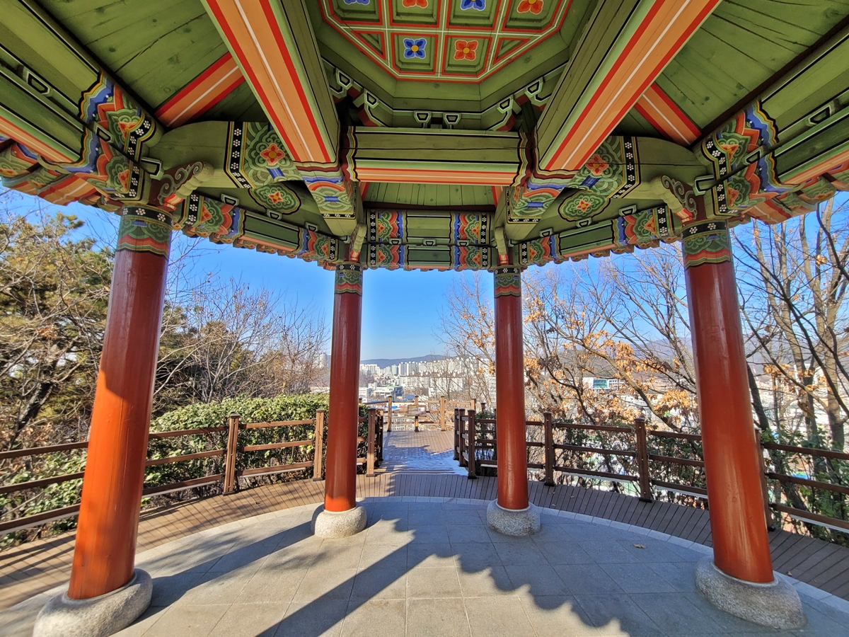 광장에서 보면 조원동 방향으로 정자가 하나 보입니다. 퉁소바위를 보려면 이 정자로 올라가야 합니다. 정자는 최근 단청을 새로 해서 아주 깔끔해 보입니다. 정자로 올라서면 기둥 사이로 조원동 일대가 한눈에 보입니다.