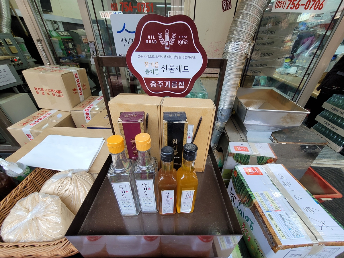 기름골목에서 선물 세트도 판매합니다. 옛날에는 참기름, 들기름 선물을 소주병에 담아서 팔았는데요, 이제는 세련된 병에 담아 판매합니다. 가격은 1만 원에서 3만 원대까지 다양한데요, 참기름 1병, 들기름 1병 등 총 2병 세트가 많이 팔린다고 합니다.