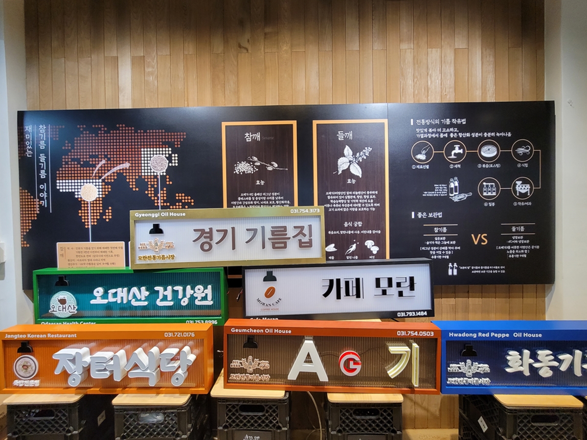 기름골목은 기름을 사러 오는 사람이 많지만 깔끔합니다. 그 이유는 매대를 통일해서 가게 앞에 놓았기 때문입니다. 전에는 가게마다 매대가 크고 작아 조금 혼잡했는데요, 상인회에서 만든 로고와 디자인이 돋보였습니다.
