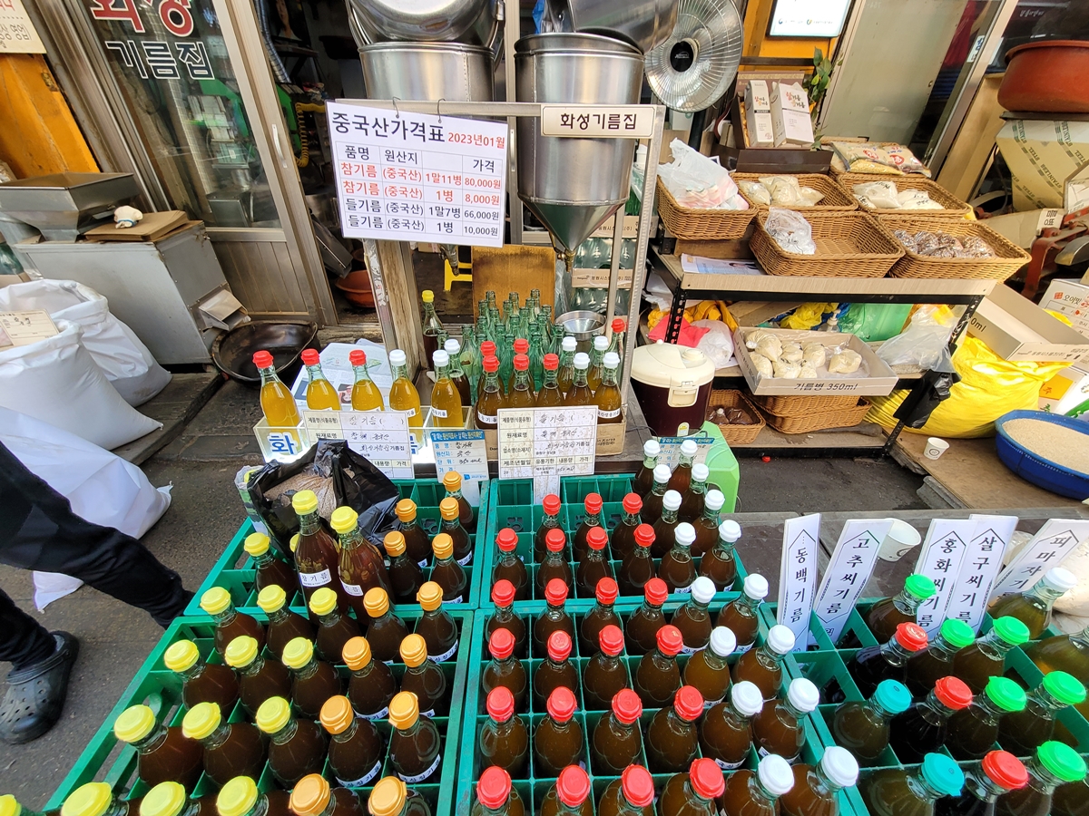 기름골목은 원산지 표시제를 철저히 지키고 있습니다. 판매하는 기름은 국내산, 중국산으로 구분을 해놓고 있습니다. 국내산이 중국산과 비교할 때 가격이 2~3배 비싸지만, 고소한 풍미가 깊어 국내산이 더 많이 팔린다고 합니다.