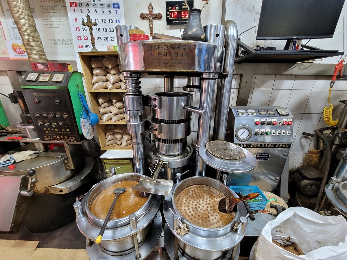제가 단골로 다니는 기름집에 가보면 오래된 기계에서 기름을 짜고 있습니다. 언제 가도 위생적으로 아주 깔끔하게 기름을 짜기 때문에 믿고 살 수 있죠. 농사지은 참깨, 들깨를 가져와도 즉석에서 기름을 짜줍니다.