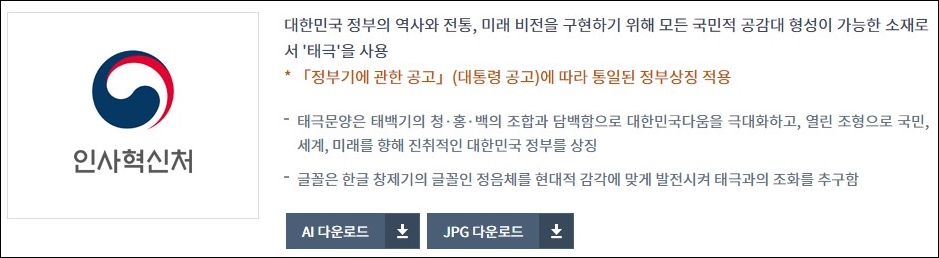 인사처 로고를 볼까요. 정부 부처 모든 로고에 태극기 문양이 들어 있잖아요. 이는 「정부기에 관한 공고」(대통령 공고)에 따라 통일된 정부 상징을 적용하는 겁니다. 인사처도 대한민국 정부의 역사와 전통, 미래 비전을 구현하기 위해 모든 국민적 공감대 형성이 가능한 소재로서 '태극'을 사용합니다.