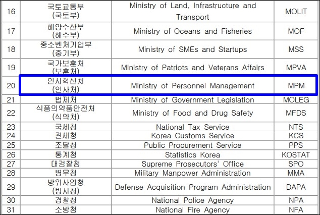 여기서 돌발퀴즈 하나 내겠습니다. 유 퀴즈? 인사혁신처는 공식 명칭인데요, 혹시 약식 명칭(줄임말)이 뭔지 아시나요? 인사처, 인혁처, 혁신처 중 어느 것이 정답일까요. 정답은 인사처입니다. 영어로 인사혁신처는 Ministry of Personnel Management인데요, 정부 조직 영어 명칭에 관한 규칙 제13조 별표에 보면 ‘인사처’라고 나와 있습니다.