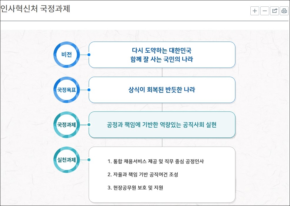 새 정부 출범을 맞아 인사처는 '국민의 나라, 정의로운 대한민국' 실현을 위해 정부혁신과 연계한 통합적인 인사혁신, 사람존중 인사혁신을 추진하고 있습니다. 신라 원성왕 때부터 실시된 관리 선발 제도를 이어받아 왔으니 인사처의 역사가 1천 년이 넘습니다. 공정한 과거제도를 통해 인재가 등용하였듯이 인사처는 공정한 채용제도를 통해 국가발전과 국민편의를 증진시킬 인재를 선발하고 있습니다.