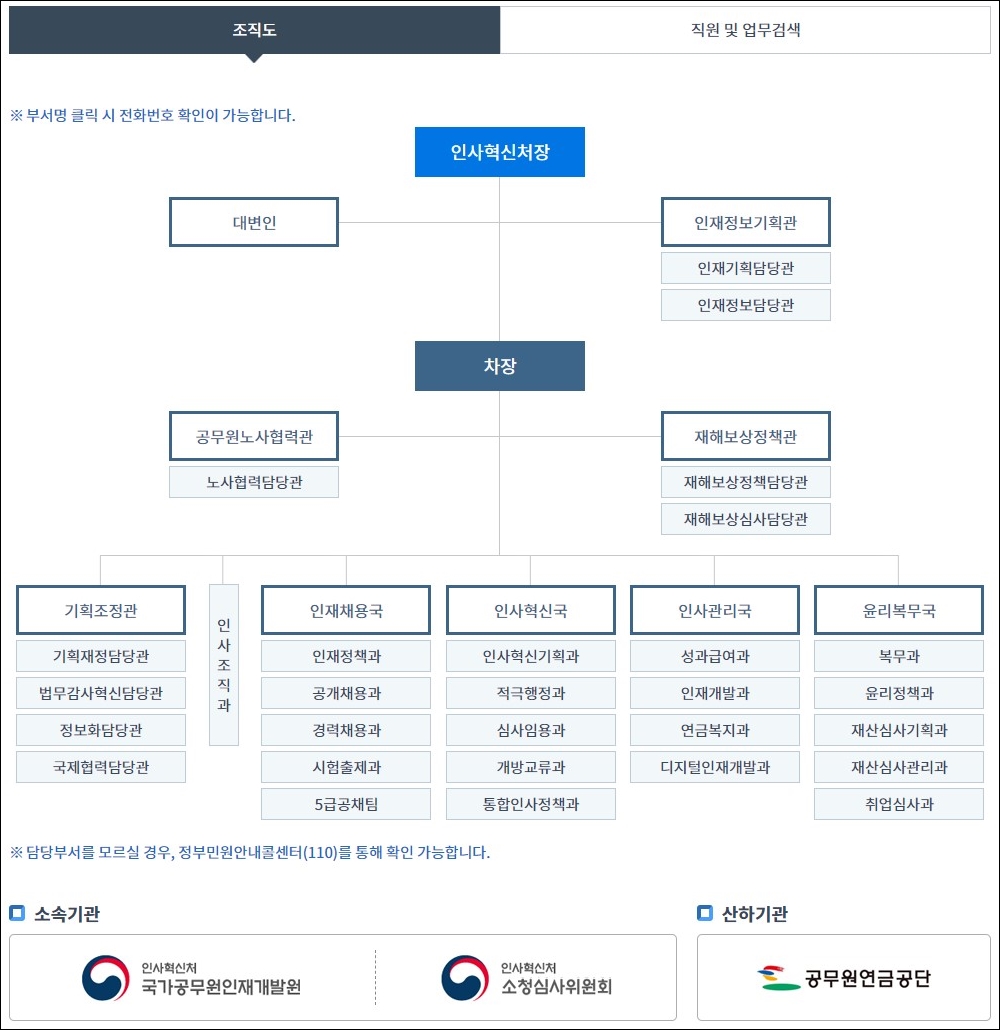 대한민국 정부는 대통령을 중심으로 다양한 조직이 있습니다. 정부24에서 우리나라 국가행정부처를 보면 다양한 조직이 있는데요, 그중 인사혁신처(이하 인사처)는 국무총리 직속 기관인 국무조정실 산하 부처입니다. 인사처는 2014년 11월 19일 자로 신설되었는데요, 공무원의 인사·윤리·복무 및 연금에 관한 업무를 관장하며 공직사회에 아주 중요한 역할을 하는 부서입니다.