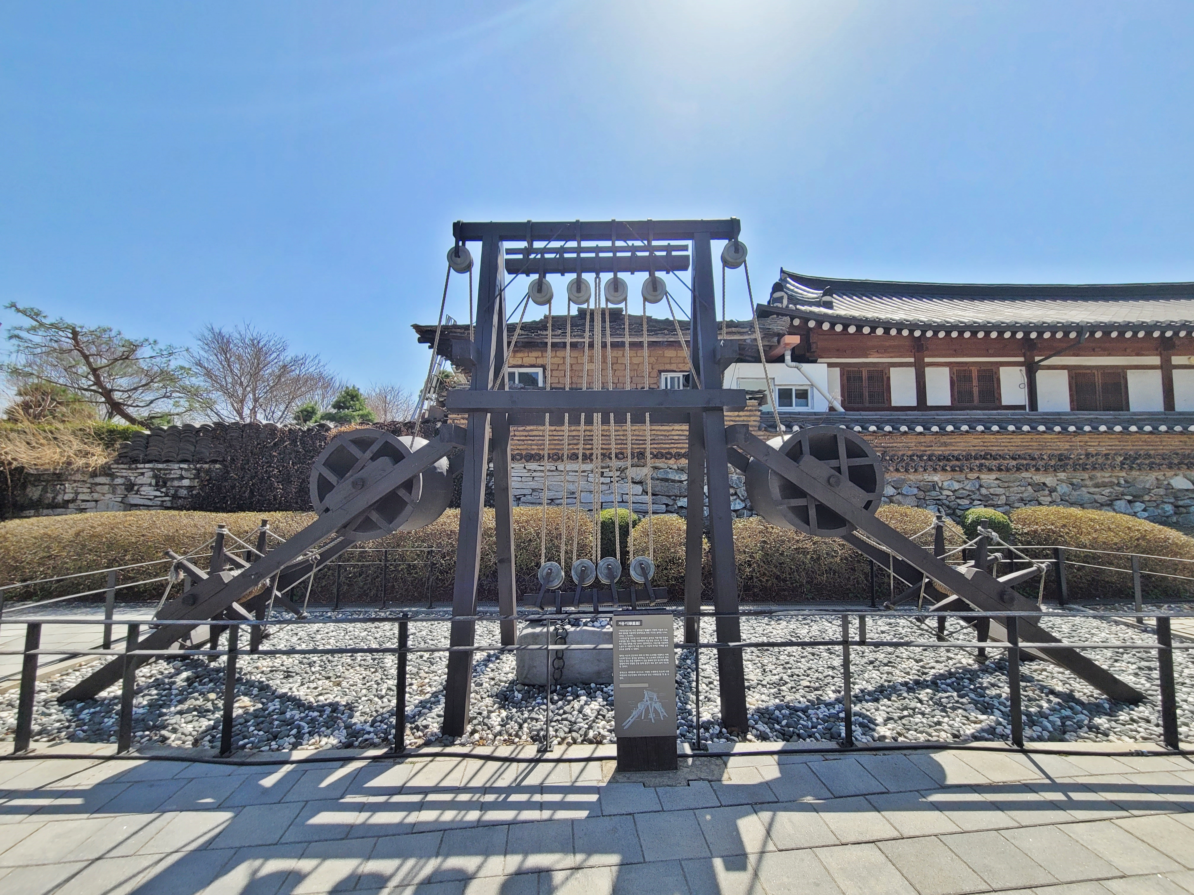 정약용 유적지 정문 앞에는 거대한 거증기가 있습니다. 설명 판을 보니 장애인 눈높이에 맞게 설치되어 있네요. 거중기는 1792년(정조 16) 다산 정약용이 서양의 기술과 도르래의 원리를 이용하여 창의적으로 만든 기구입니다. 높이는 4.4m, 너비는 1.7m입니다. 이 거증기로 수원화성을 쌓았죠. 거중기는 노동자 두 사람이 약 10t 또는 그 이상의 무거운 자재를 높은 곳으로 운반할 수 있다고 하니, 정약용이 아니었다면 수원 화성을 제대로 쌓았을까요?