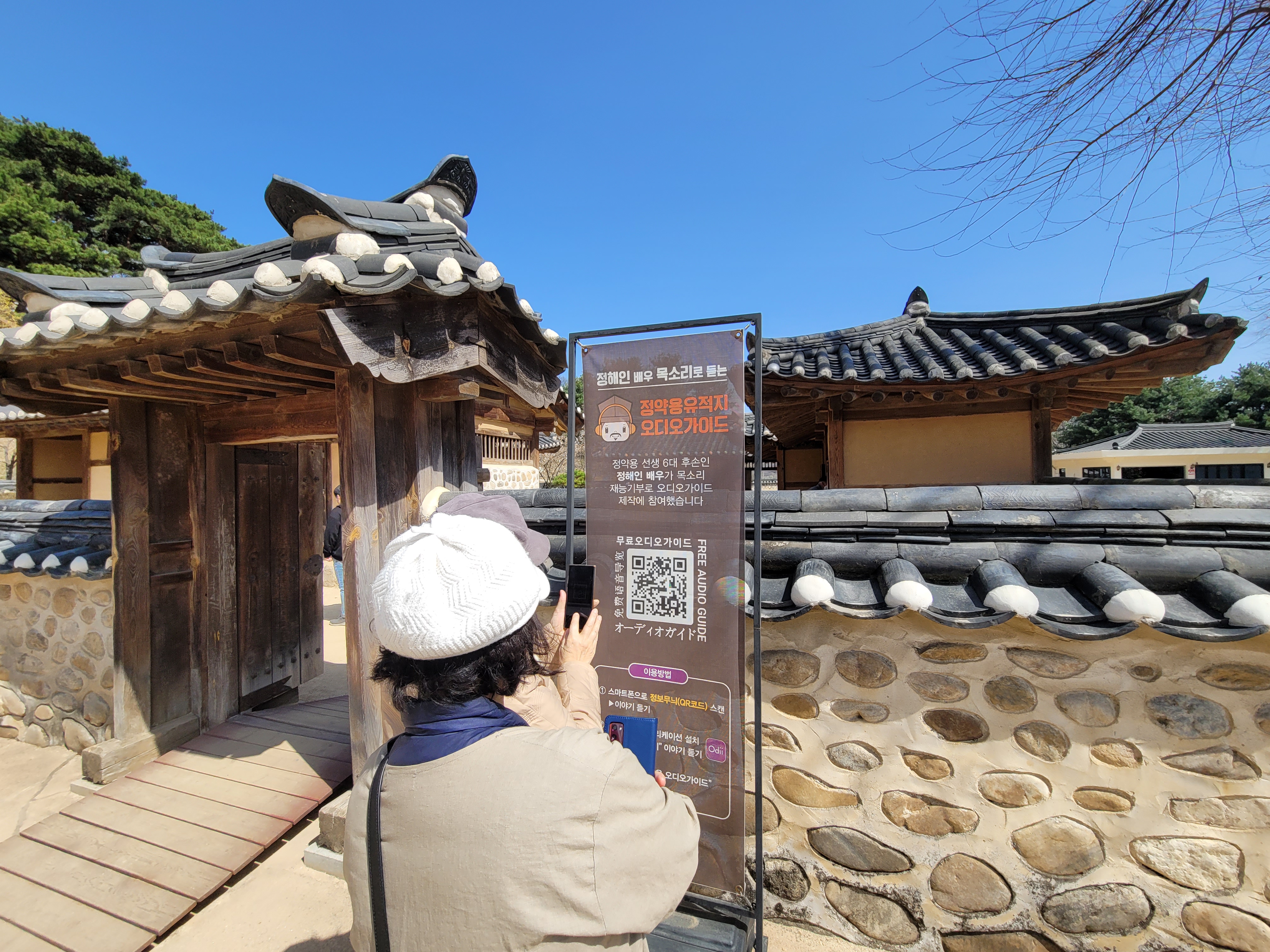 여유당 좌·우측에 문이 있는데요, 이곳도 문턱이 없습니다. 그리고 시각장애인을 위해 오디오 가이드를 마련했습니다. QR코드에 스마트폰을 가져다 대면 정약용의 6대 후손인 정해인 배우가 들여주는 목소리로 해설을 들을 수 있습니다. 물론 일반인도 들을 수 있고요, 무료입니다.