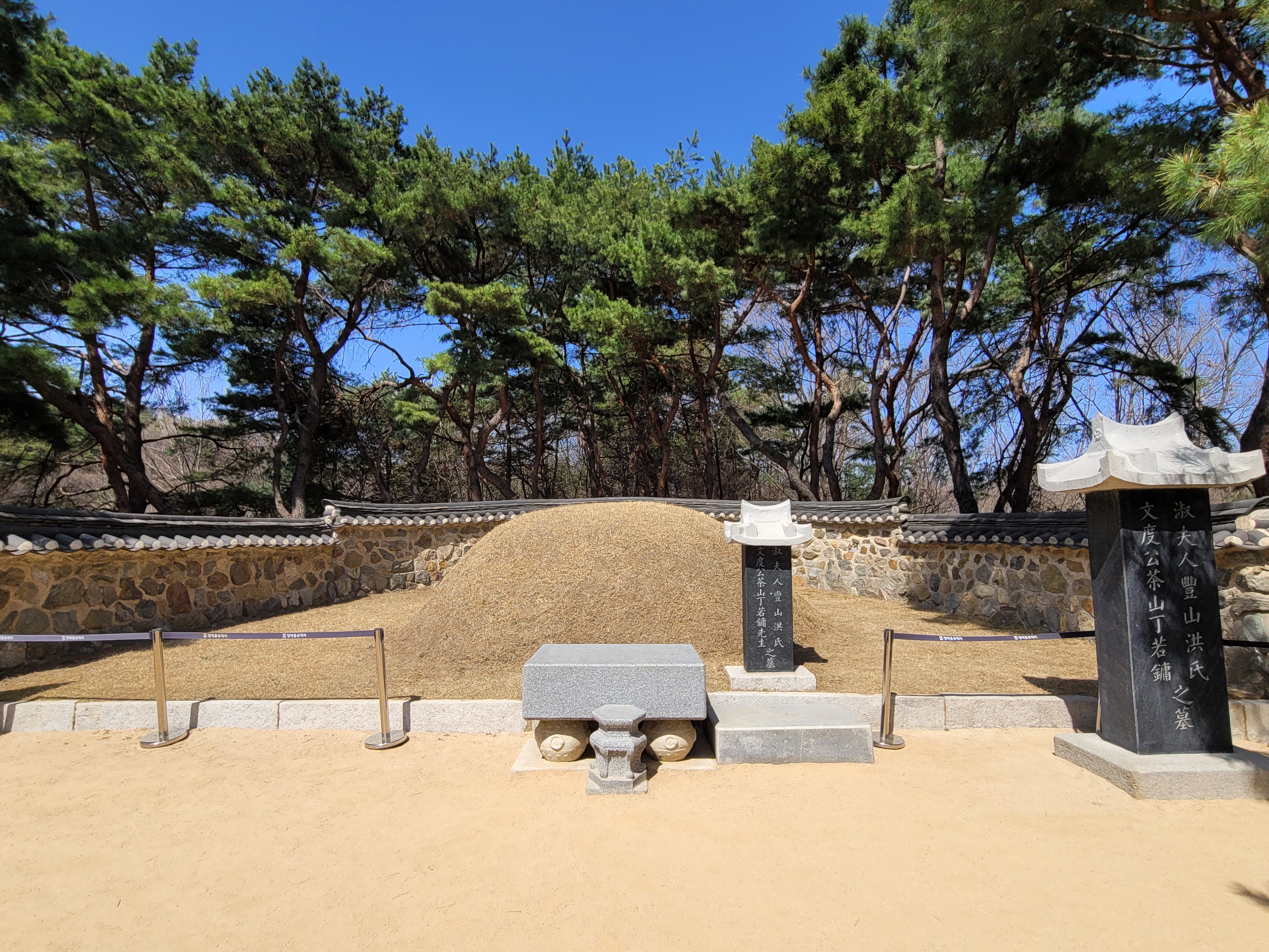 여유당 뒤에 정약용 선생 묘소가 있습니다. 묘소는 가파른 계단으로 이뤄져 휠체어가 오르긴 어렵습니다. 그래서 묘소 입구에 한문으로 ‘다산 정약용 선생지묘’라고 쓴 비석이 있습니다. 묘소 대신 비석 앞에서 추모하면 되겠죠. 저는 정약용 선생 묘소까지 올라갔습니다. 묘소에서 보니 생가가 한눈에 내려다보였습니다.