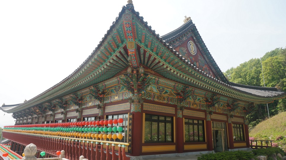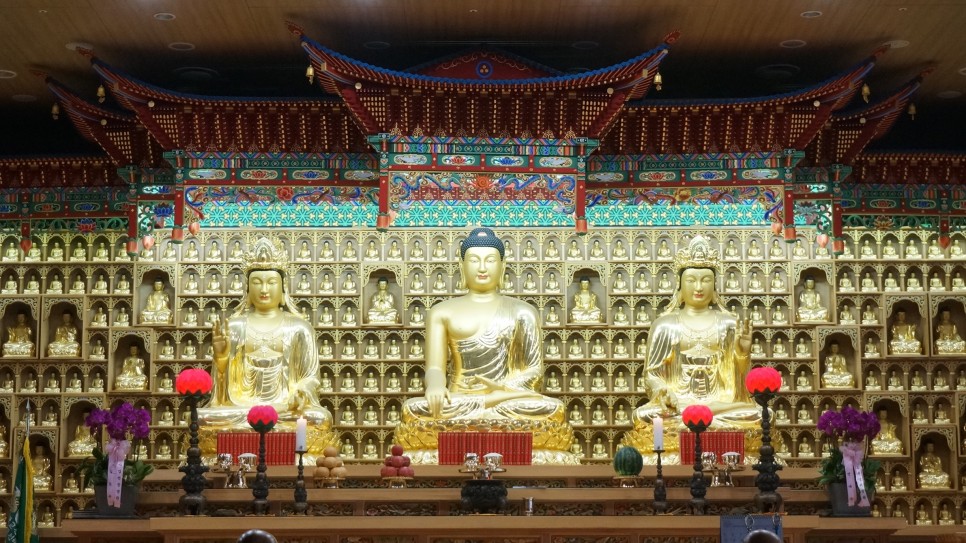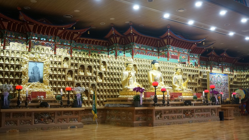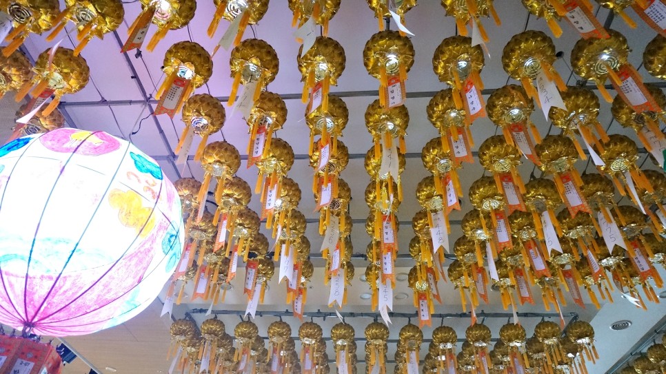 이제 법당으로 한 번 들어가 볼까요? 법당에 들어서니 엄청난 규모에 놀랍니다. 이렇게 큰 법당은 처음입니다. 법당 안은 한 여름에도 더위를 식혀줄 만큼 서늘하고 시원했습니다. 불자들이 부처님 앞에서 가족들의 건강, 남편 승진, 자녀 대학 합격 등 소원을 빌며 열심히 '관세음보살'을 반복하며 기도하고 있었습니다. 법당 천정에는 불자들의 기원을 담은 금색 연등이 잔뜩 걸려 있었습니다.