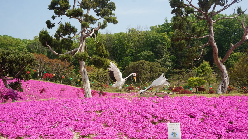 사찰 우측에는 분홍색 꽃잔디가 피었는데요, 가까이 가보니 그곳에 두 마리의 백로가 있습니다. 제가 볼 때는 부부처럼 보였어요. 아주 다정하게 노닐고 있습니다. 불곡산 자락이라 소나무 등 푸른 숲으로 둘러쌓인 대광사에 꽃잔디가 화려하게 피어나니 아주 돋보입니다. 꽃잔디 군락지에서 사람들은 기념사진 촬영하느라 여념이 없습니다.