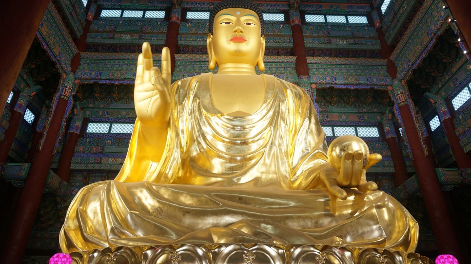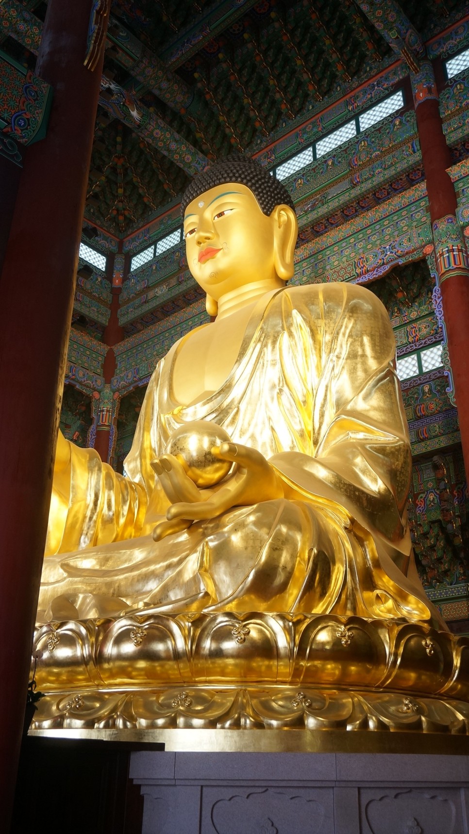 높이가 33m, 목재는 홍송 600년~900년 수령의 나무를 사용했고요, 그 목재량만 해도 11톤 트럭 200대 분량을 사용했다고 합니다. 이 건물은 약 14년간의 공사기간을 거쳐 내부에 금동좌상 미륵대불을 모시고 있는데요, 한 번 보실까요?