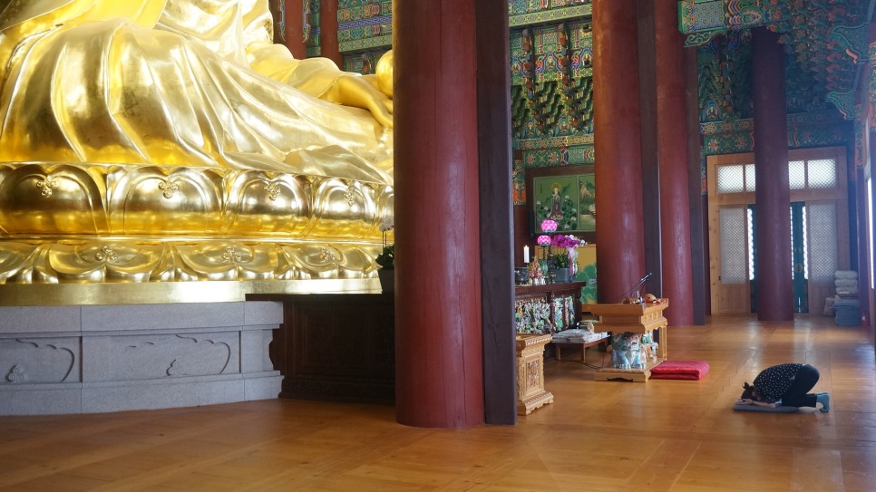 글과 사진만으로는 실감이 안 가시죠? 미륵대불 앞에서 절을 하는 불자를 보면 얼마나 어마어마한 높이인지 조금은 짐작이 가실 겁니다. 이곳에 들어서면 법당보다 더 서늘한 기운을 느끼게 됩니다. 에어컨을 킨 것보다 훨씬 더 시원했습니다.