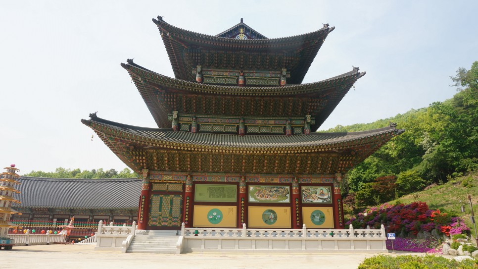 법당에서 두 개층을 더 올라가면 미륵보전이 있는 5층입니다. 저는 법당을 구경한 후 걸어서 올라갔습니다. 이곳이 미륵보전입니다. 현판이 3개라 언뜻 보면 3층처럼 보이잖아요? 그런데 미륵보전은 전체 건물이 1개층처럼 통건물입니다. 웅장하면서도 그윽한 건축미를 자랑하는 전통건축물처럼 만들어져 시선을 빼앗길밖에 없는데요, 단일 목조건축물로는 세계 최고 수준을 자랑한다고 합니다.