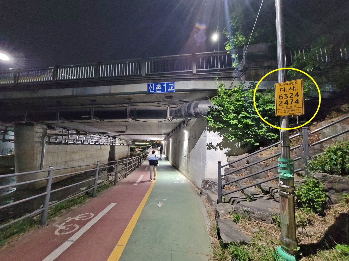 정평천을 걷다 보면 국가지점번호(노란색 원)가 있습니다. 이 번호는 위급상황 시 필요한 번호인데요, 112나 119로 긴급전화할 때 이 번호를 불러주면 더 빨리 올 수 있습니다. 여러분도 산책하다 무슨 일이 발생할지 모르니 국가지점번호를 꼭 기억해두길 바랍니다.