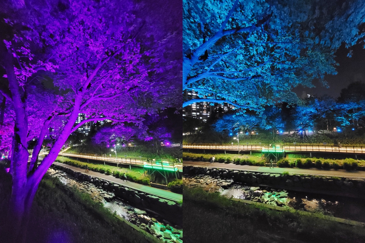 신촌3교에서 정평천을 내려다본 모습입니다. 나무를 향해 조명이 비추고 있는데요, 한 색이 아니라 여러 가지 색이 번갈아 가면서 나옵니다. 그래서 더 멋집니다.