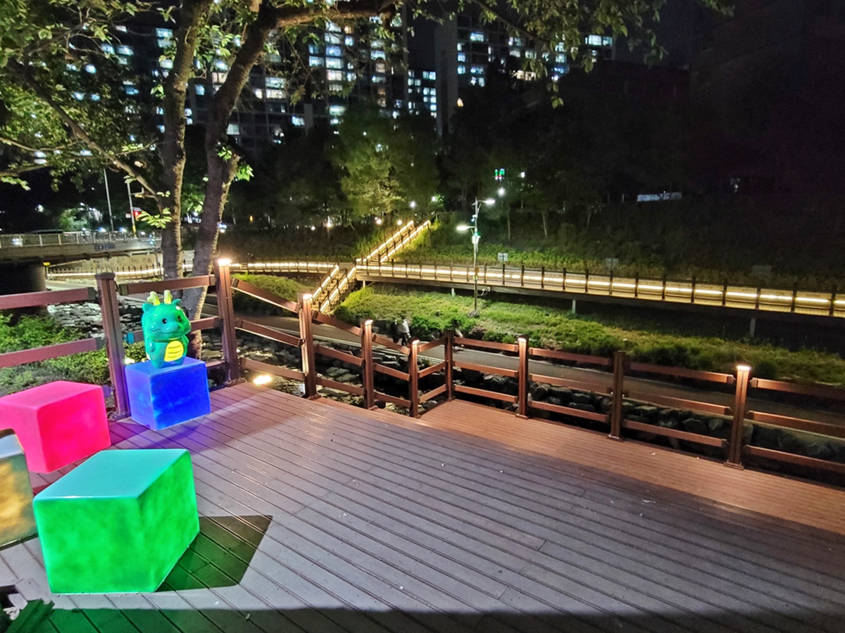 풍덕천2동 행정복지센터 옆에 나무 데크로 만든 쉼터에 정사각형 의자에 조명이 들어오고요, 그 위에 용인시 캐릭터 조아용이 앉아 있습니다. 정평천을 산책하다 보면 조아용 캐릭터를 많이 볼 수 있습니다. 신촌3교에서 정평천으로 내려갔습니다.