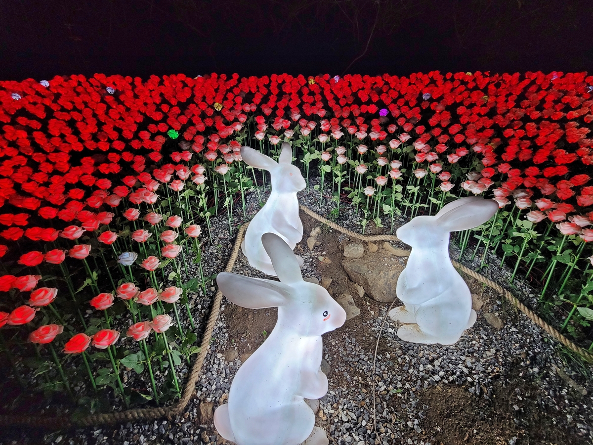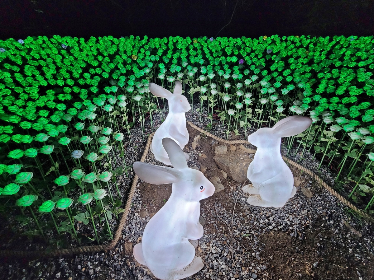 신봉동 행정복지센터를 지나 다시 정평천을 걷기 시작했는데요, 이게 뭔가요? 토끼 3마리가 장미가 활짝 핀 곳에서 놀고 있습니다. 장미는 한 색이 아니라 여러 색으로 변합니다. 저는 정평천을 밤에 처음 와봤는데, 낮보다 훨씬 더 아름답고 황홀하네요.