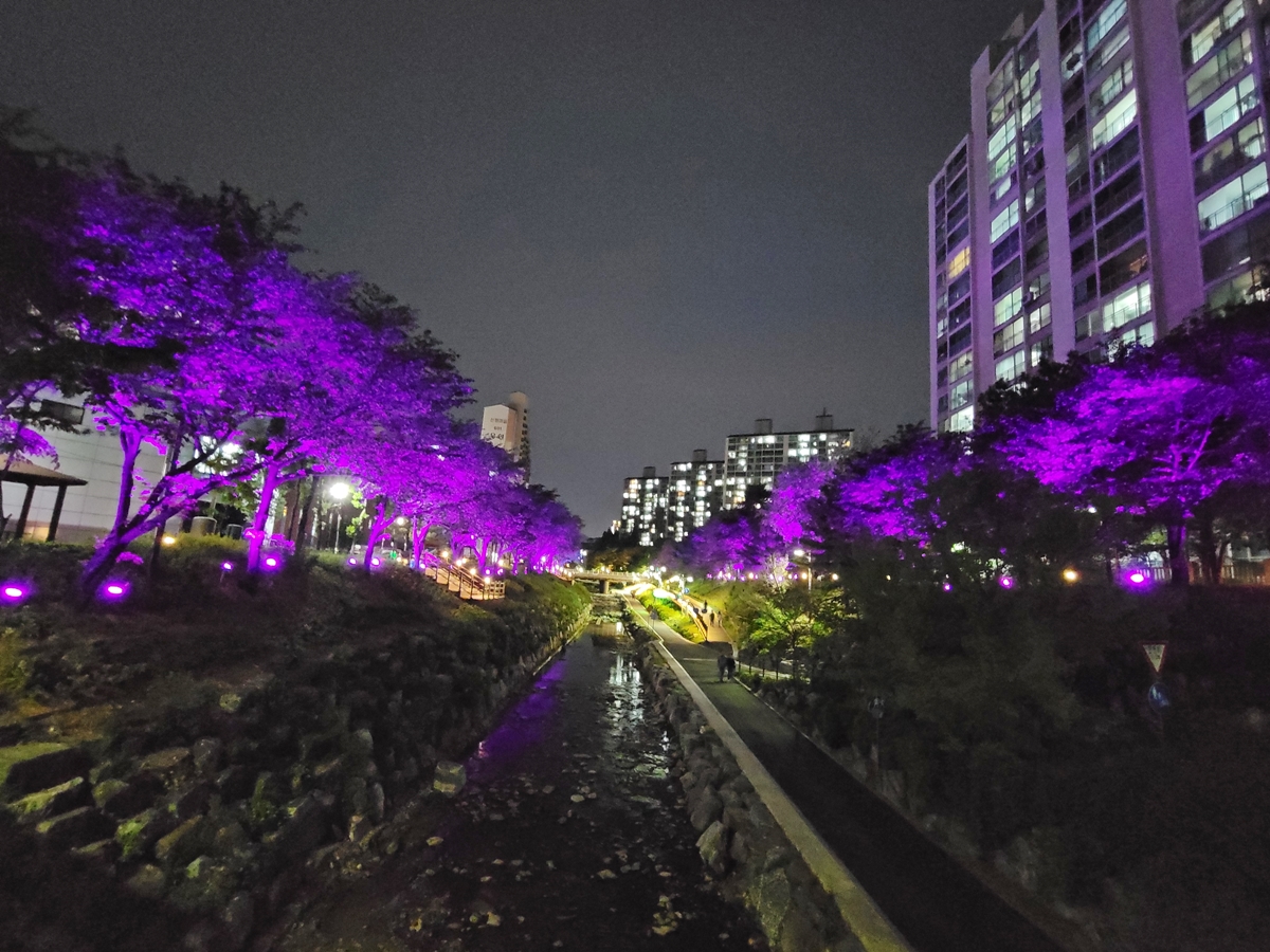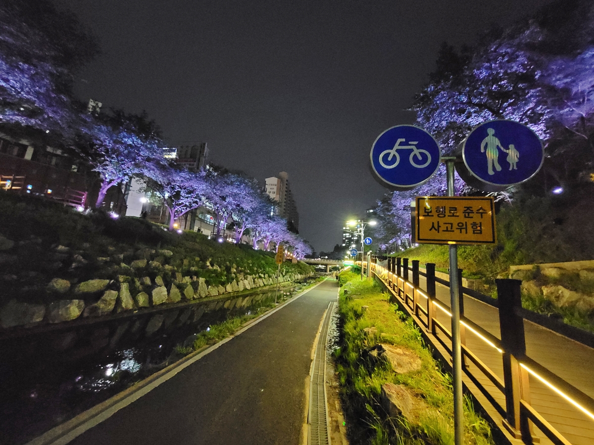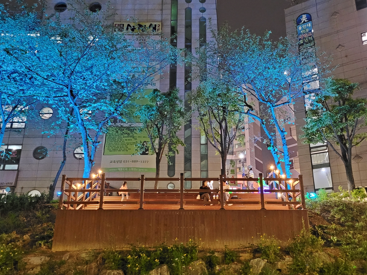 수지구 정평천 일대는 매년 봄이면 벚꽃축제가 열리는 곳입니다. 벚꽃은 잠깐 피었다가 지죠. 요즘 밤에 야경으로 시민들을 유혹하고 있습니다. 저는 풍덕천2동 행정복지센터에서 신봉동행정복지센터까지 약 500m 거리를 왕복해서 산책하곤 합니다. 이쪽이 야경이 가장 멋진 곳이거든요.
