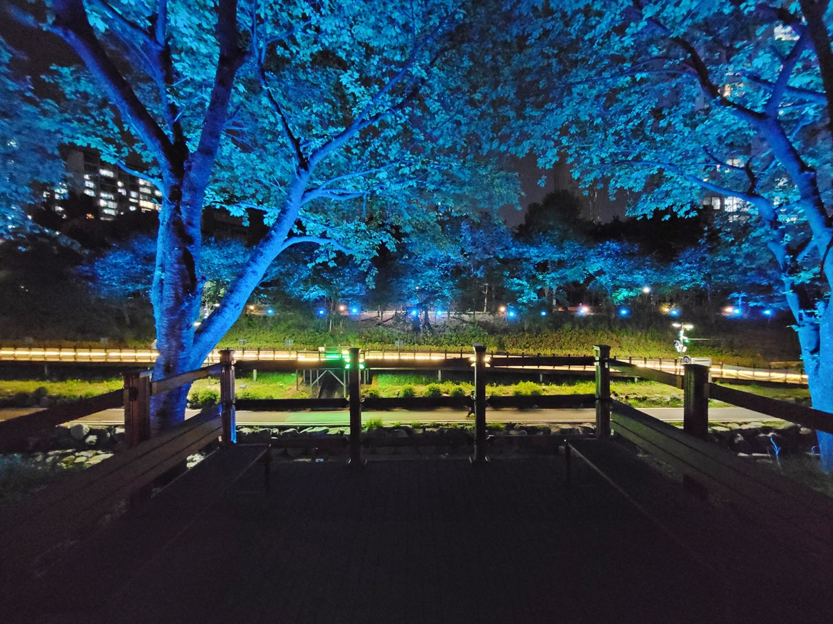 반딧불이 조명은 보행로에도 비추고 있습니다. 제가 보행로를 걸어보니 반딧불이가 제 발밑으로 막 날아다니는 듯이 보입니다. 반딧불이와 함께 산책하니 즐겁습니다. 제가 저녁 8시쯤 갔는데요, 반팔 산책 복장으로 나온 시민이 많았습니다.