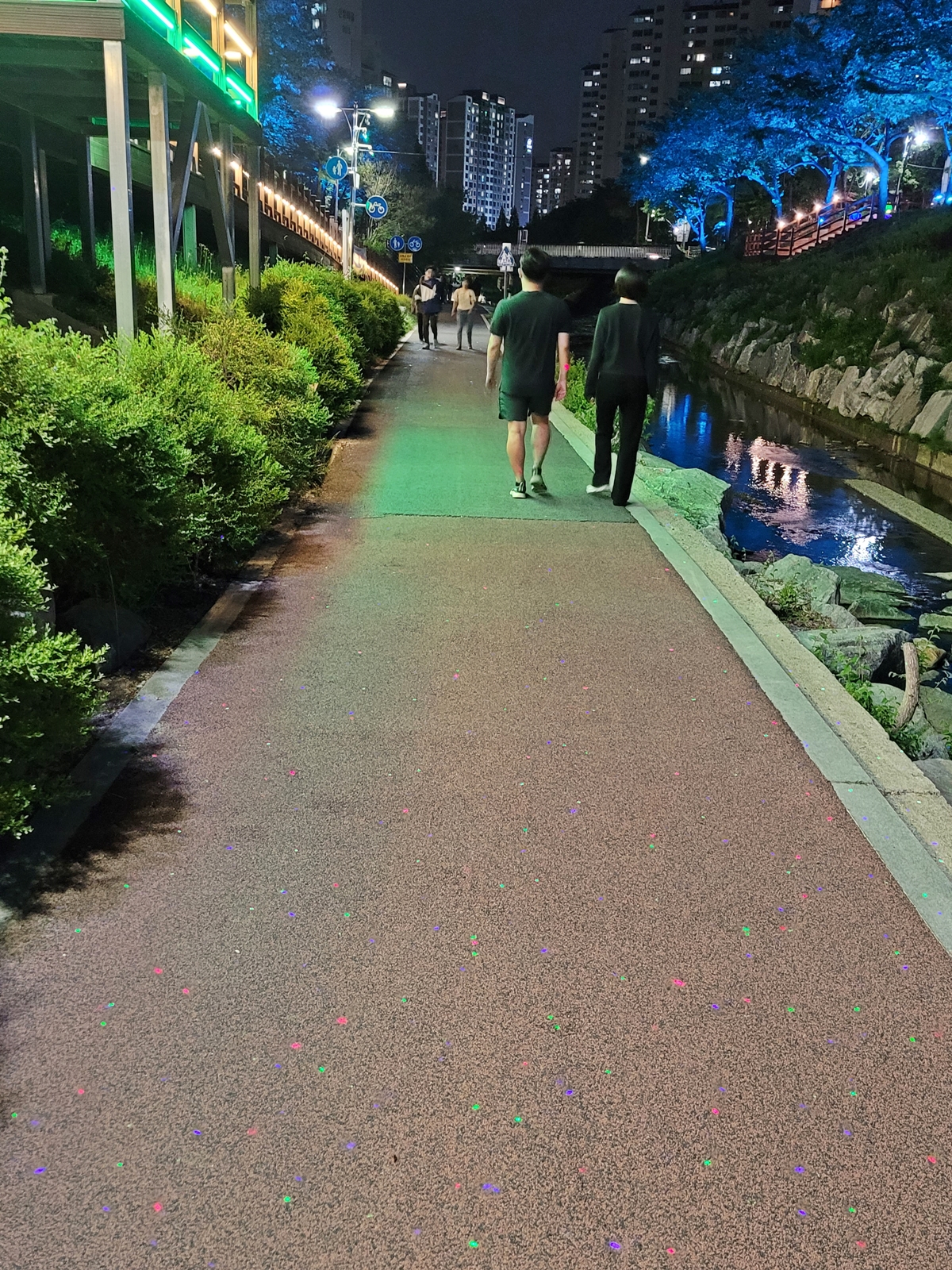 신촌1교 앞에는 조명으로 만든 꽃 군락지가 있습니다. 자세히 보면 수국을 닮았는데요, 오색 조명이 더해져 아주 멋진 야경을 보여주고 있습니다. 용인시 수지구에서 정평천 산책로 환경개선 공사를 한다고 하는데요, 날로 정평천이 좋아지고 있네요.