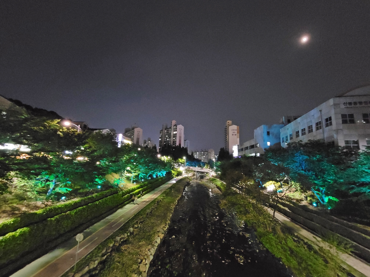 정평2교에서 풍덕천 방향으로 내려다본 모습입니다. 하늘에는 달이 두둥실 떠 있고요, 정평천에는 좌우로 나무가 오색 빛을 뽐내며 시민들을 유혹하고 있습니다.