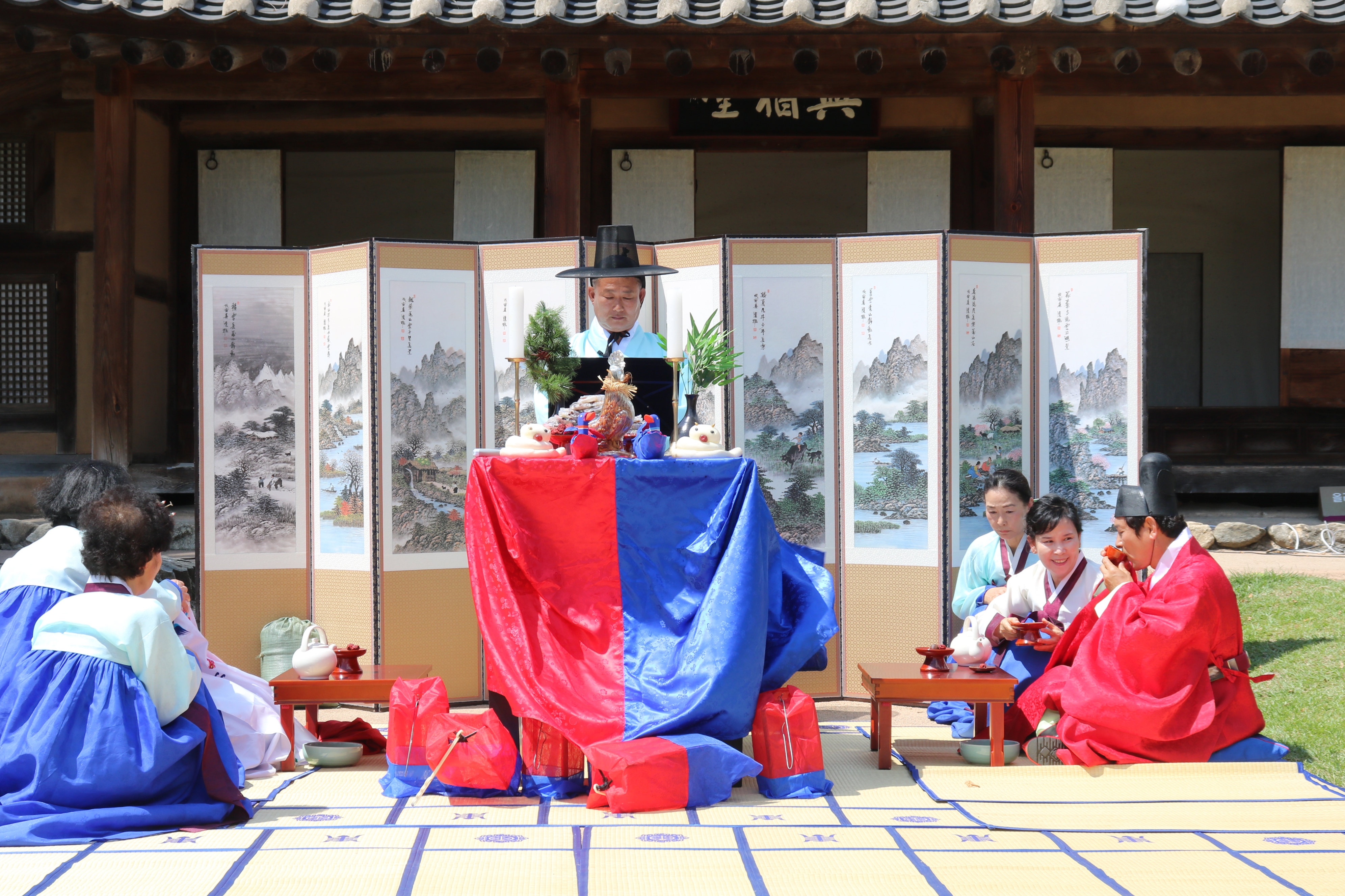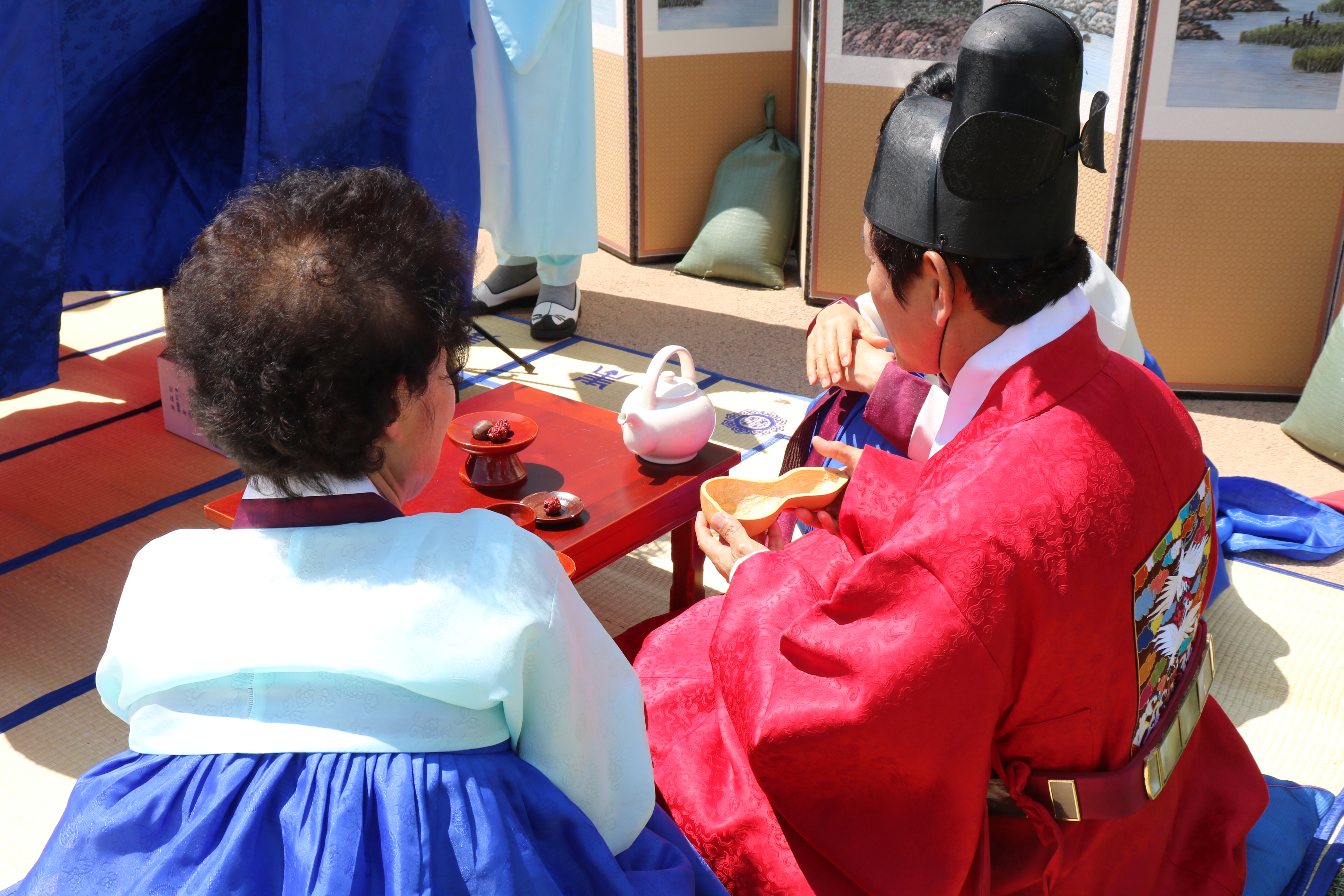 다음은 신랑과 신부가 부부로서 인사를 나누는 시간입니다. 신랑이 한 번씩 두 번, 신부가 두 번씩 네 번 절하는데요, 이는 남녀 차별이 아니라 음양의 원리에 따라 남자는 양이므로 기본수인 한번, 여자는 음이므로 기본수인 두 번이 남녀가 절을 하는 기본 횟수가 되겠지만, 혼례 의식에서는 기본의 배를 행하는 것이 올바른 예법이라고 합니다.