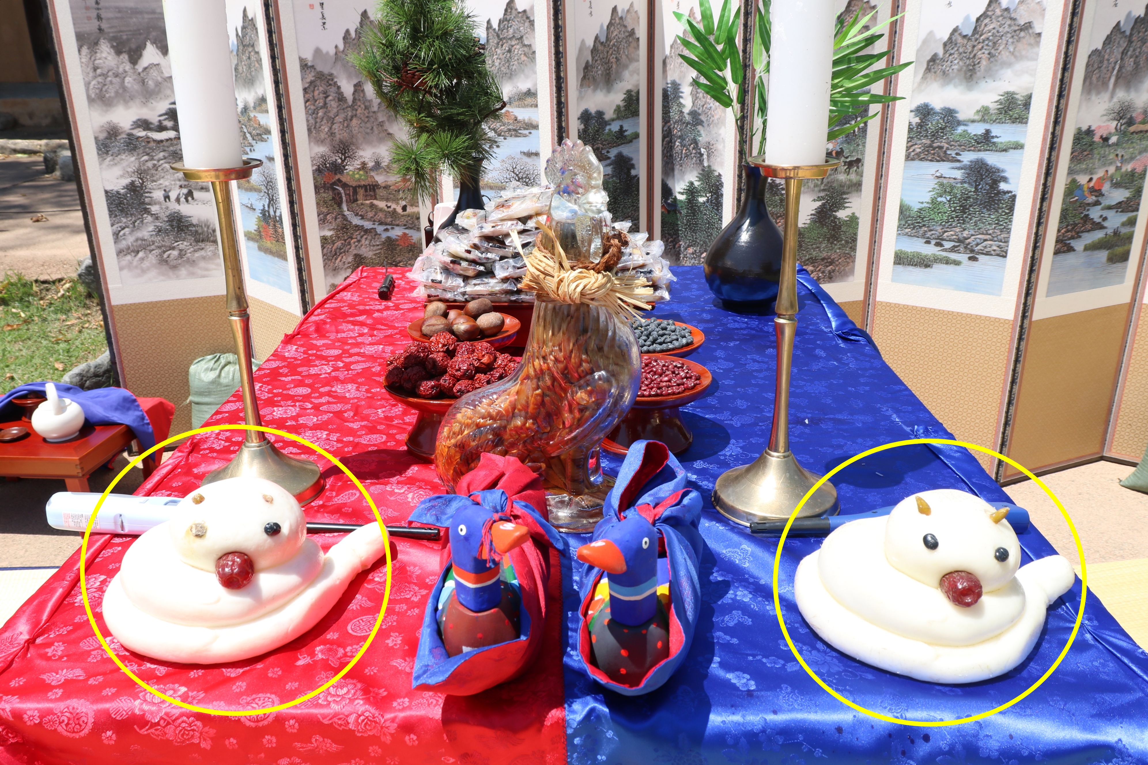 결혼식은 잔칫날이잖아요. 옛날은 결혼식 날 국수를 대접했죠. 국수처럼 길게 오래 살라고요. 다산부부 회혼식에는 특별한 떡이 있었는데요, 용떡(노란색 원)입니다. 용의 기운을 받아서 신성한 아들을 낳으라고 조안면에서 결혼식에서 용떡을 올렸다고 합니다.