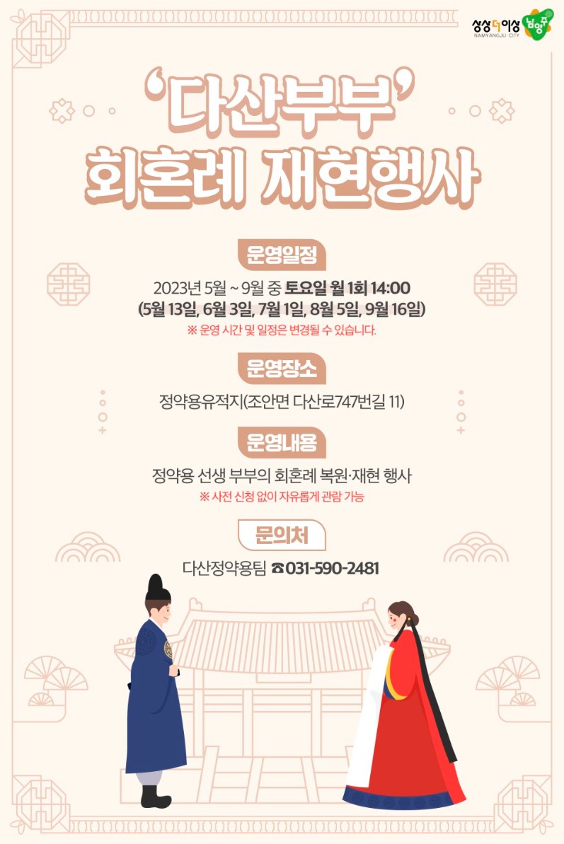 2023년 남양주시가 조안면 지역주민으로 이루어진 다산 전례 문화보존회와 함께 정약용 선생 부부의 회혼례를 재현하는 것은 참 반갑고 뜻깊은 일입니다. 지금의 결혼식은 결혼식장에서 30분 만에 뚝딱 끝나잖아요. 전통혼례식은 TV에서만 봤었는데요, 직접 보니 많은 가정에 꼭 권하고 싶은 볼거리라는 생각이 들었습니다.