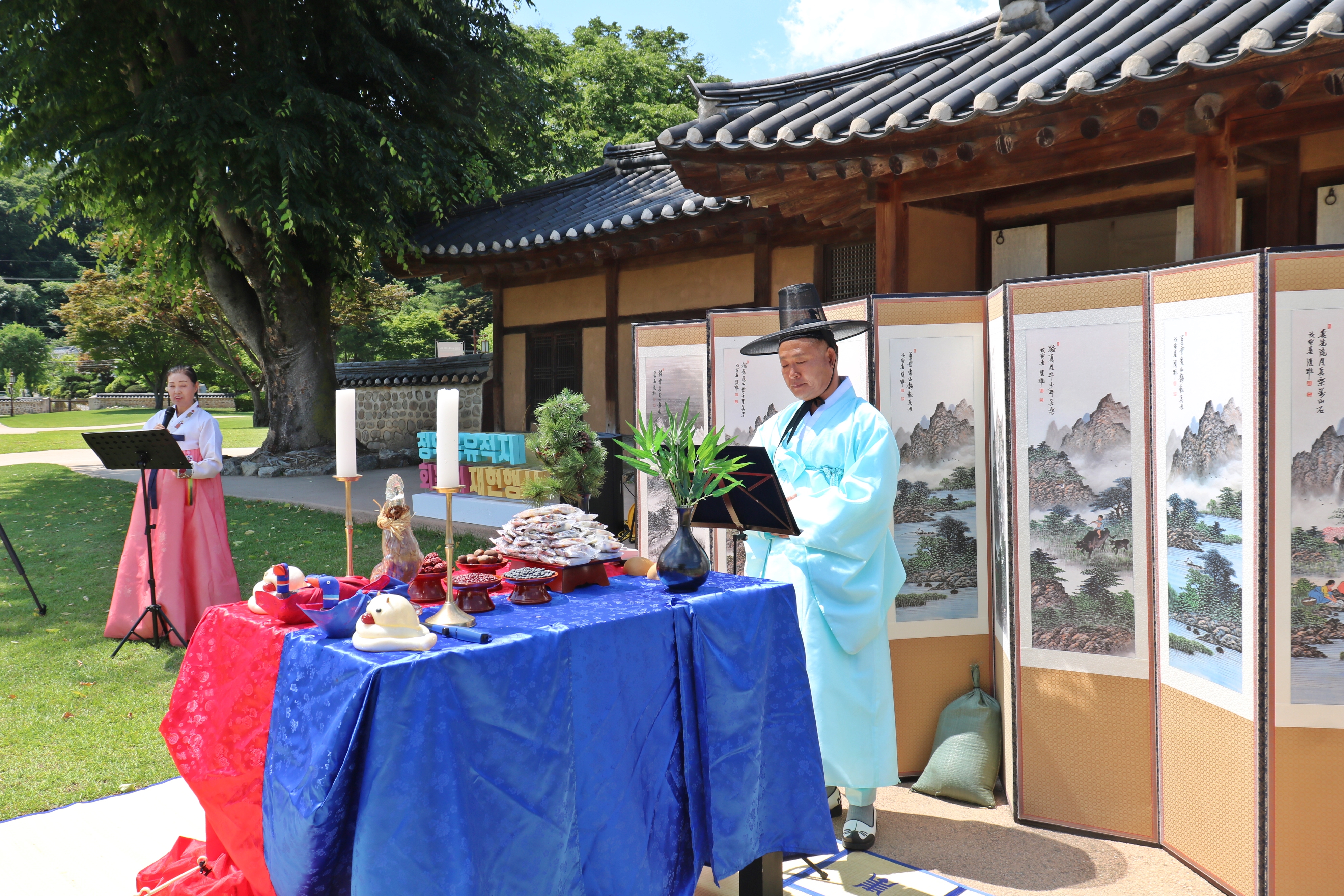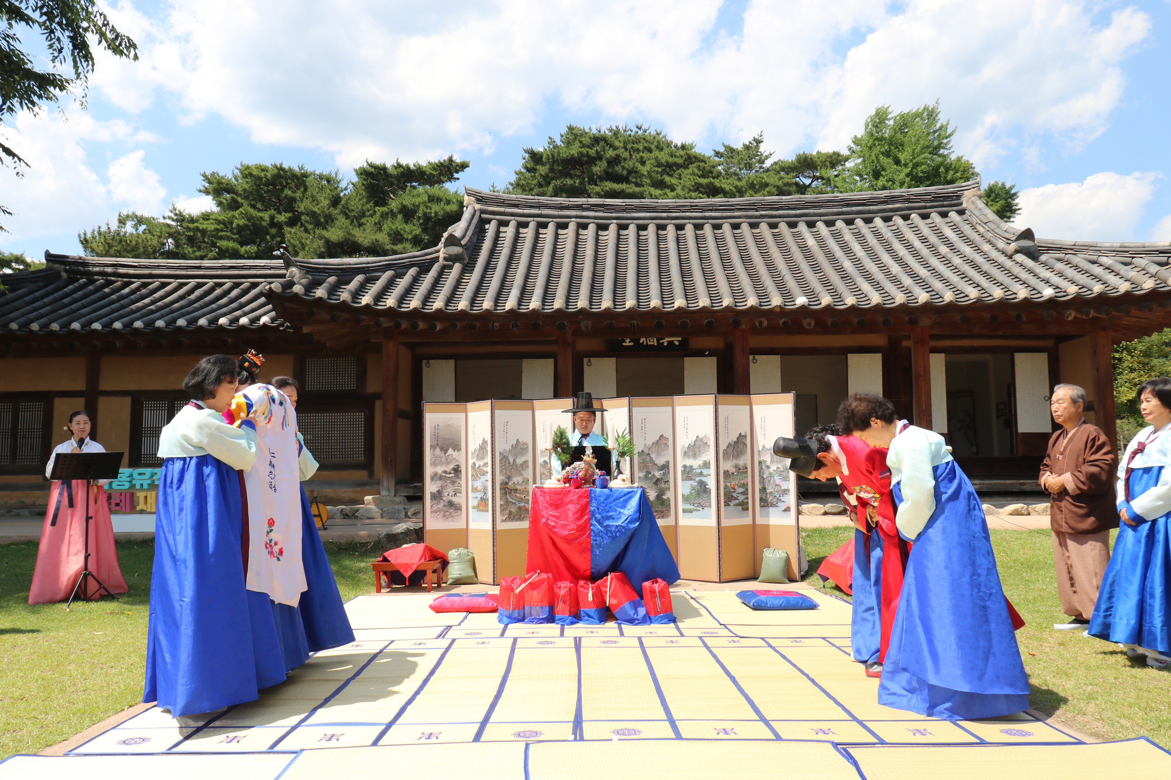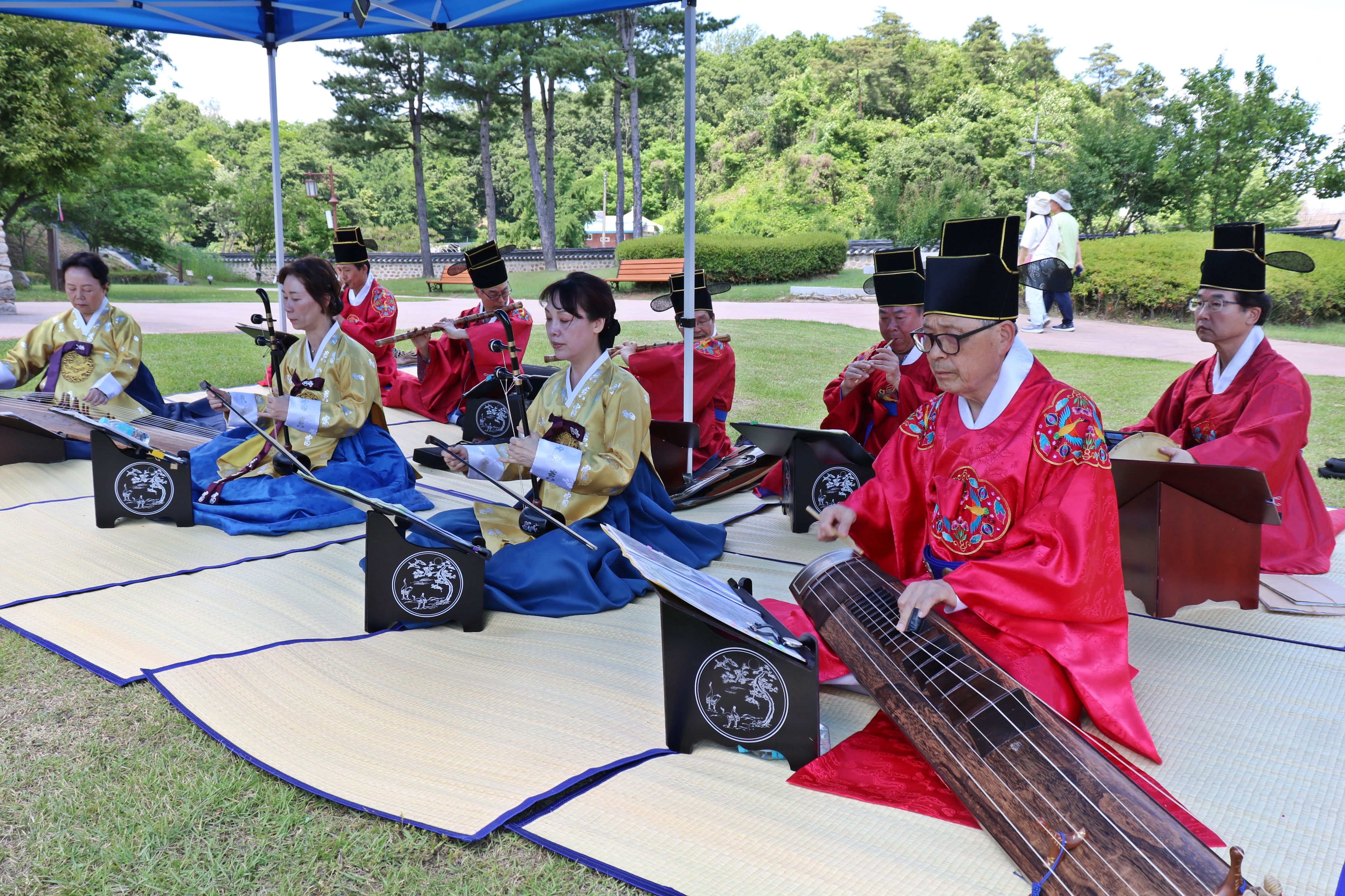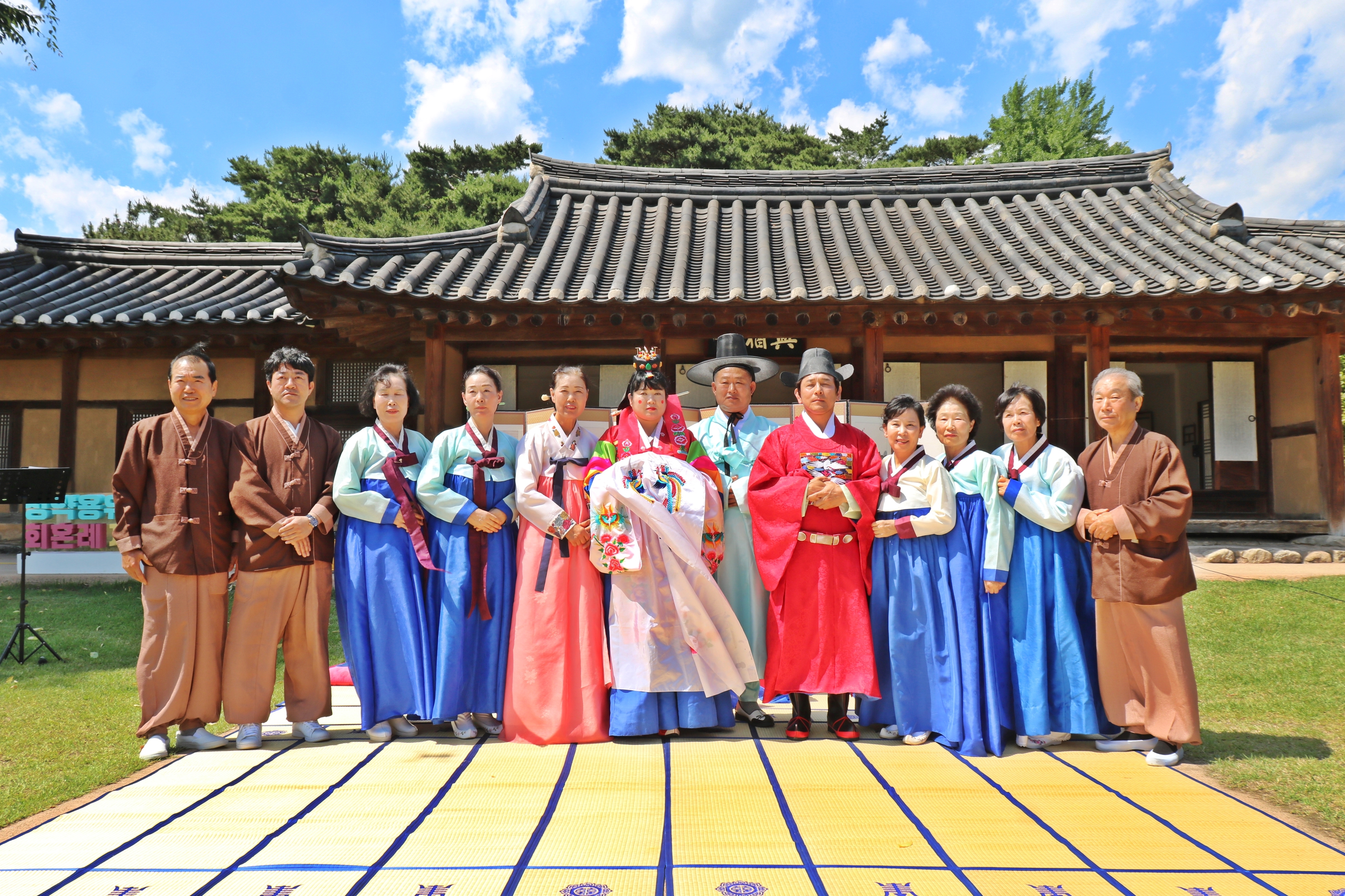 여유당 앞마당에서 회혼식 준비가 한창입니다. 식장 준비가 끝났고요, 해솔풍류회원 9명이 회혼식 축하 연주를 위해 대기하고 있습니다.