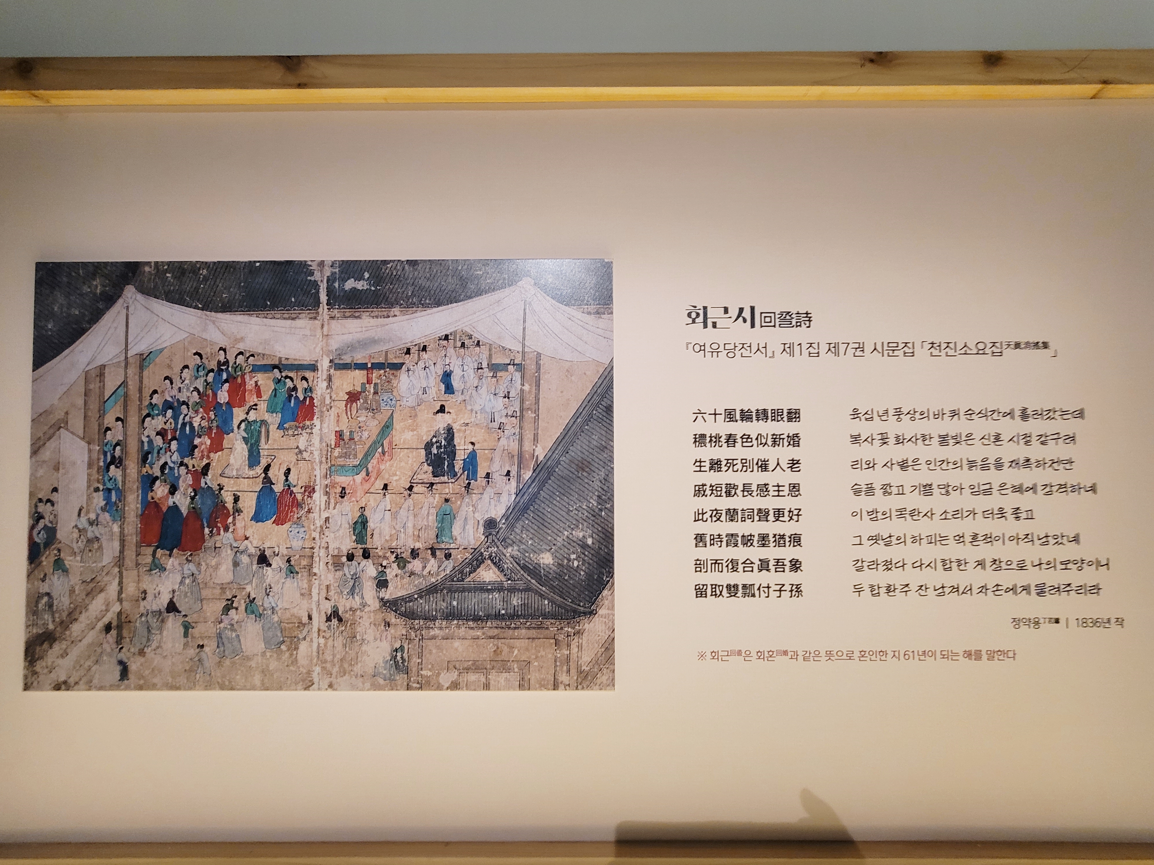 회혼식 마지막 순서는 다산 정약용의 회근시(回巹詩) 낭독입니다. 회근(回巹)은 회혼(回婚)과 같은 뜻으로 혼인한 지 61년이 되는 해를 말합니다. 신랑이 정약용 선생을 대신해 하객들 앞에서 낭독했습니다.