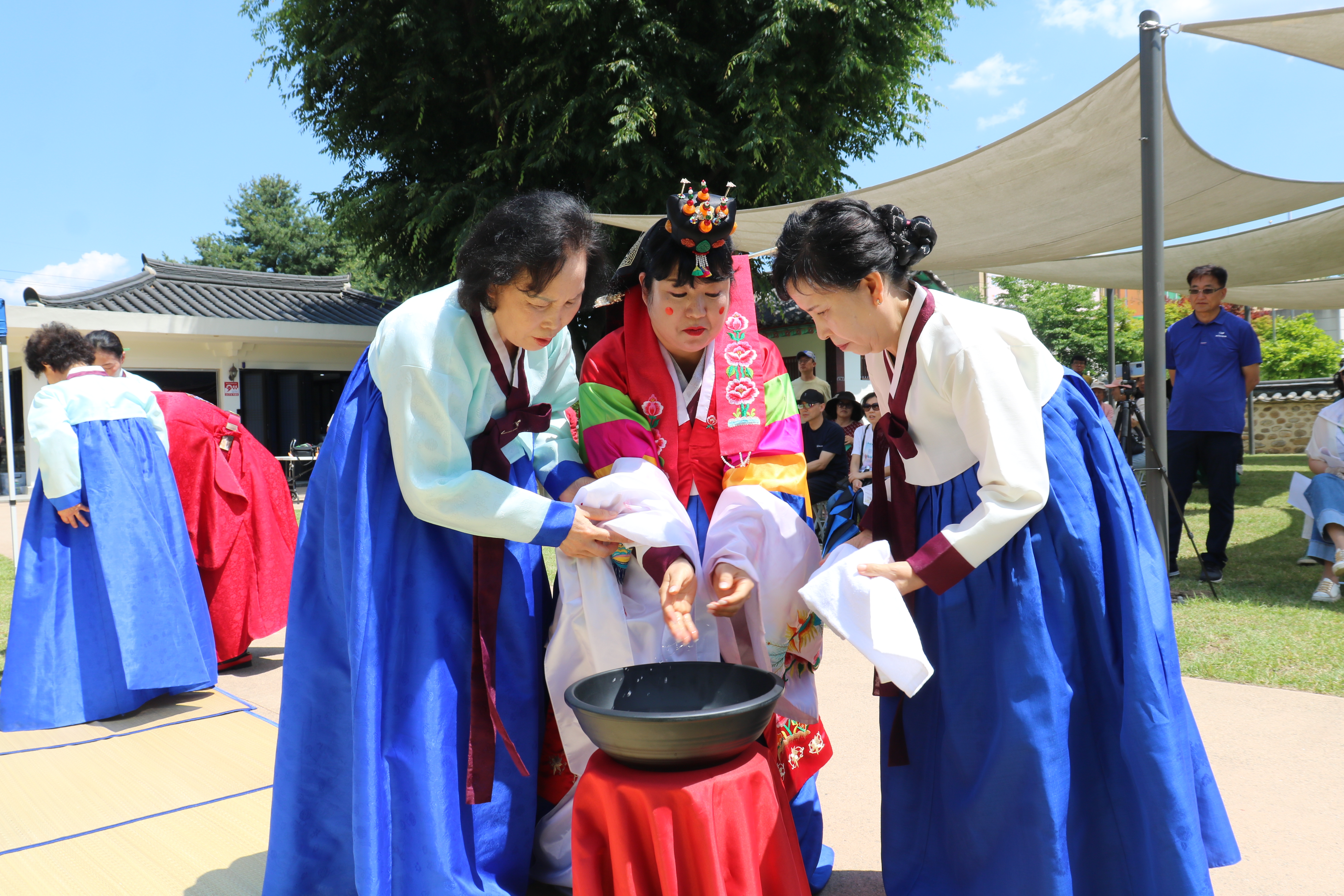 결혼식은 신성한 행사기 때문에 식전에 신랑 신부가 몸과 마음을 정결하게 한다는 의미로 손을 씻습니다. 지금도 그렇지만 신랑과 신부를 옆에서 보조하는 사람이 정성을 다하고 있습니다.