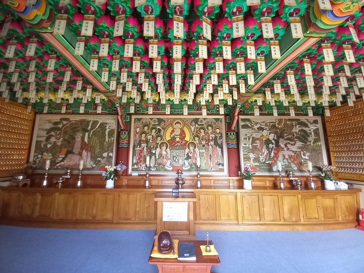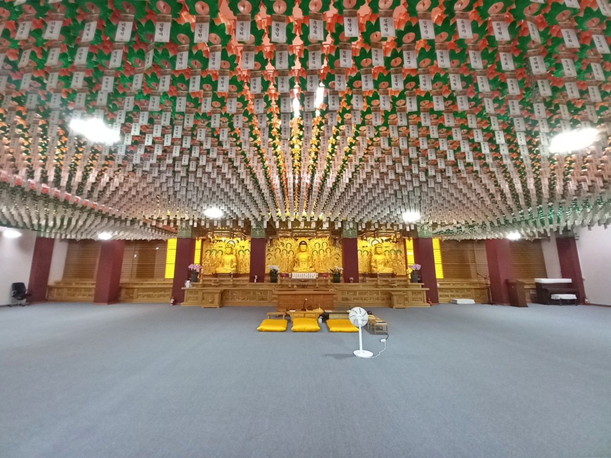 마지막으로 주차장 앞에 있는 선문화체험관입니다. 이곳은 불자 등 누구나 출입할 수 있습니다. 이곳에서 법회도 하고 선문화 등 교육도 하는 곳인데요, 강당처럼 굉장히 넓습니다. 천정에는 불자들의 바람이 적힌 연등이 빼곡하게 매달려 있습니다. 취업, 가족 건강, 승진 등의 소망이 꼭 이뤄지길 바랍니다.