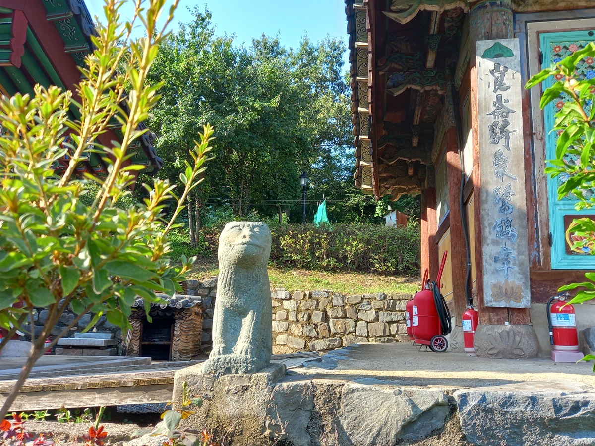 기단 좌우에는 마치 사자를 닮은 돌짐승 상이 있어 특이합니다. 돌짐승 상은 대웅전 좌·우측에 두 개가 있습니다.