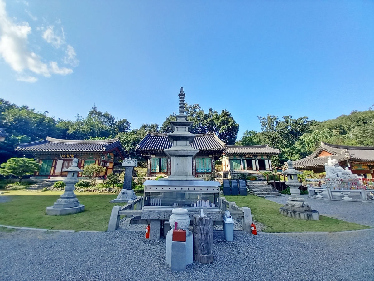 경내에서 정면으로 석탑과 그 뒤로 대광명전이 보입니다. 경내에 있는 삼층 석탑은 부처님 진신사리를 모신 곳입니다. 이곳에 태국에서 모셔온 부처님 진신사리 1과가 모셔져 있다고 합니다. 파란 하늘을 향해 솟은 석탑을 보니 경외감이 듭니다.