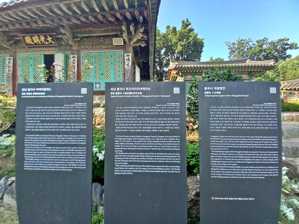 대광명전 앞에는 안내판이 세 개가 보이는데요, 대광명전 건물은 물론 아미타불회도, 목조아미타여래좌상에 대한 자세한 설명이 있습니다. 세 개 모두 경기도 유형문화재입니다. 후세들에게 전해야 할 소중한 불교문화 유산들입니다.