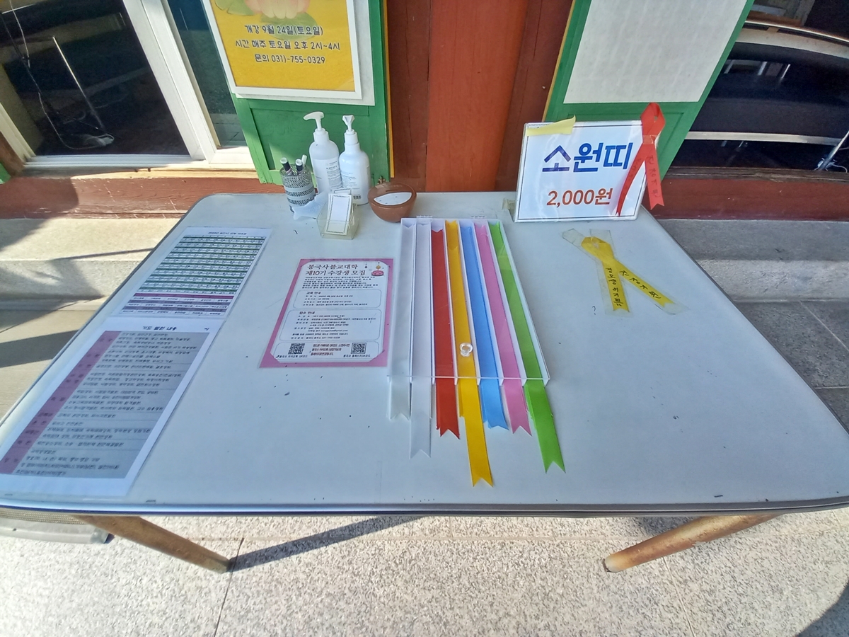 포대화상 앞에는 불자들의 기원이 적힌 소원 띠가 걸려 있습니다. 종무소 앞에서 소원 띠를 팔고 있습니다. 이 소원 띠에 무슨 바람을 적을까요? 저는 로또 당첨보다 가족의 건강과 소박한 행복을 빌었습니다.