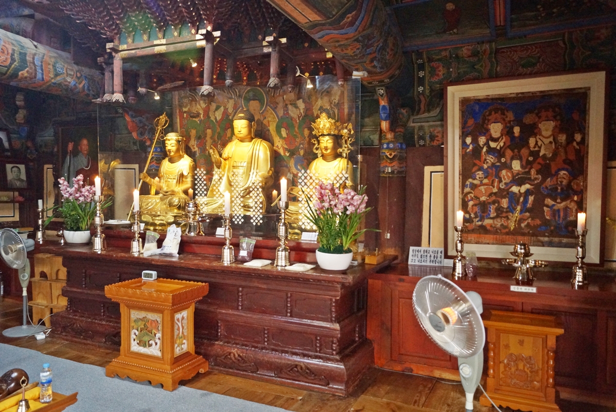 사찰 전각은 중앙 문은 스님들만 출입할 수 있고요, 불자들은 옆문으로 들어가야 합니다. 대광명전은 비로자나불을 모시는 법당이지만 이 불전에는 아미타불을 주존불로 모셨으며 좌우에는 관음보살과 지상보살을 모셨습니다. 제가 불교에 해박한 지식이 있는 건 아니고요, 불상 아래 설명이 되어 있습니다.