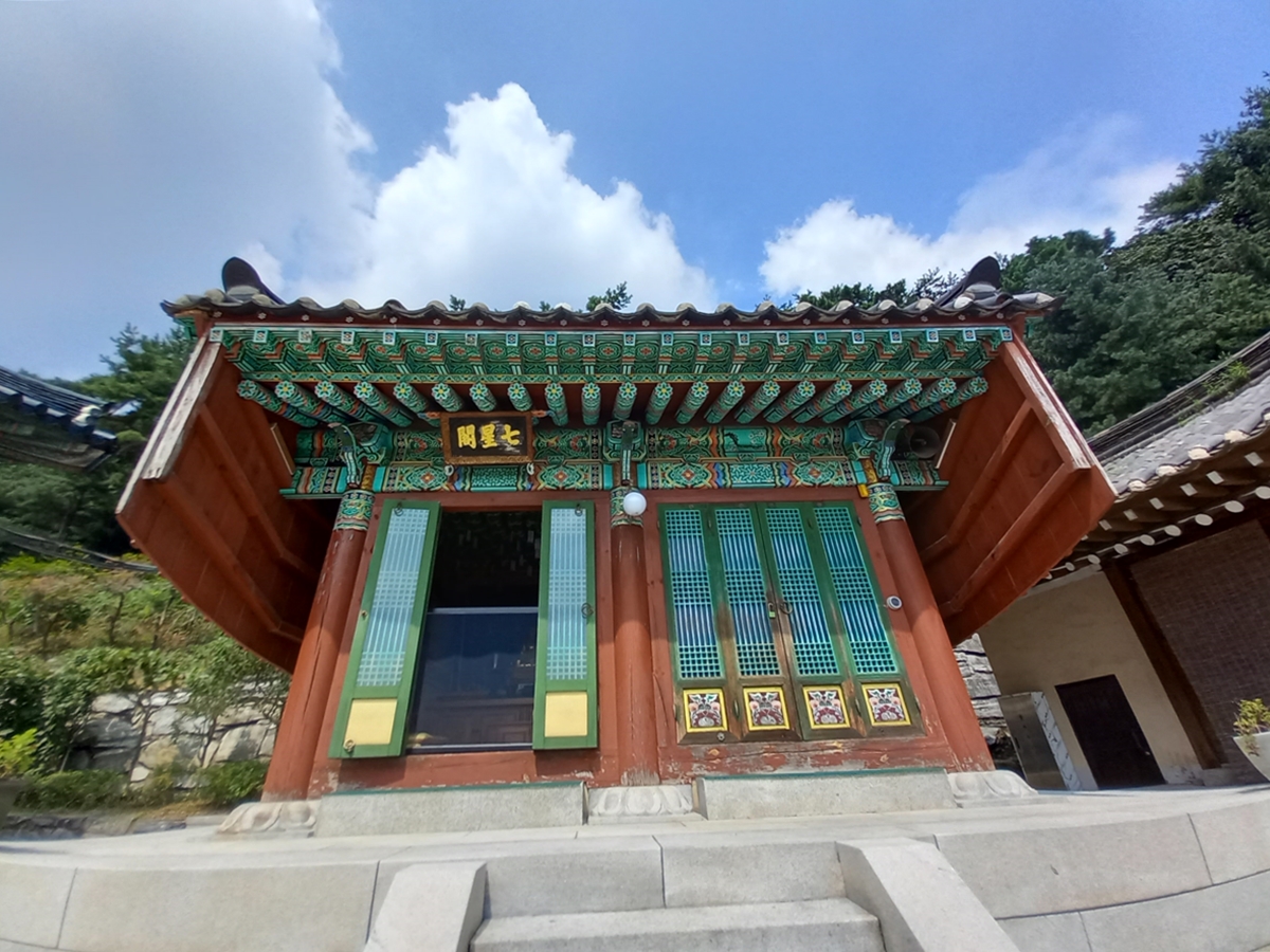 대웅전 기준으로 우측은 칠성각과 요사채가 있습니다. 칠성각 안에는 칠성상과 칠성탱화, 19세기 후반에 만들어진 산신탱화가 있습니다. 산신탱화는 가로 132cm, 세로 119cm로 호랑이 등에 앉은 칠성신이 보입니다.
