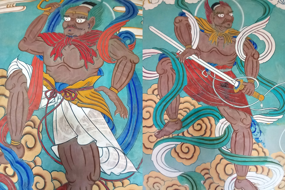 유치원 옆에 사찰로 들어서는 환희루(歡喜樓)가 있습니다. 이름 그대로 기쁘게 맞이해주는 누각입니다. 환희루로 들어가는 입구에 금강역사 탱화가 지키고 있습니다. 청련암에 악귀가 들어오지 못하게 지키고 있는데요, 볼 때마다 조금 무섭습니다.
