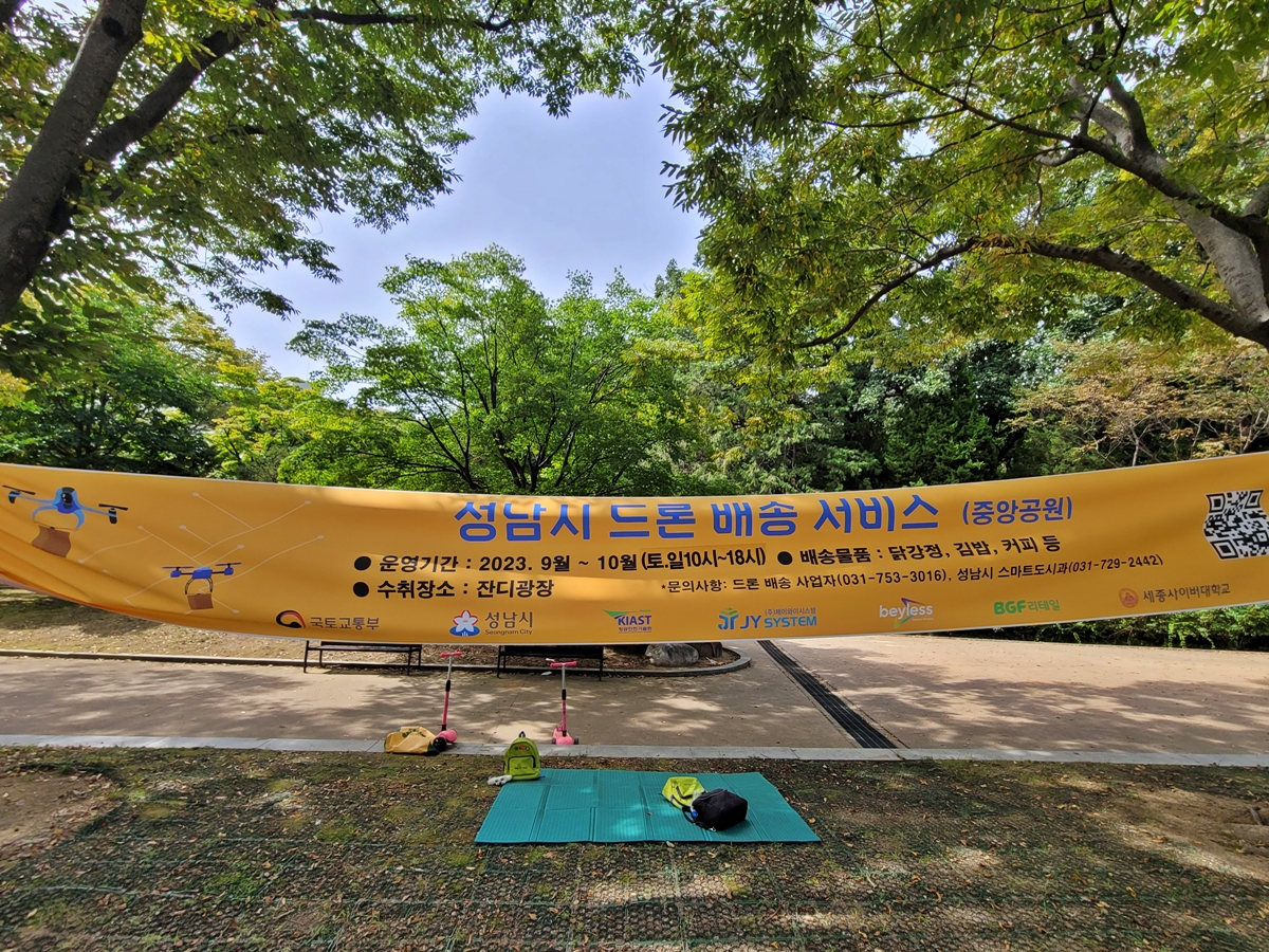 수내동가옥에서 야외음악당 쪽으로 조금 가다 보면 잔디광장이 나옵니다. 율동공원 조각공원처럼 잔디밭에 많은 사람이 나무 그늘에서 쉬고 있습니다. 성남시는 판교테크노밸리를 품은 도시잖아요. 그래서 드론 배송 서비스하고 있습니다. 공원에서 주문하면 드론이 닭강정, 김밥, 커피 등을 가져다줍니다.