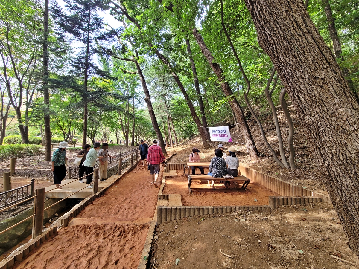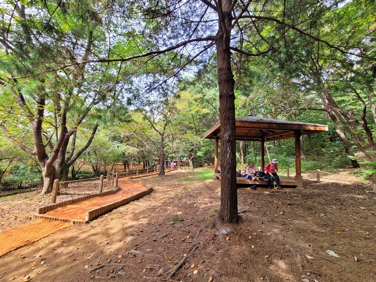 다른 곳과 마찬가지로 황톳길 중간중간에 벤치 등 쉼터가 있습니다. 벤치는 물론 정자까지 있어서 일상에 지친 심신을 달랠 수 있겠네요. 황톳길과 쉼터 모두 시원한 숲에 있어서 시민들은 피톤치드를 마시며 건강을 챙기고 있습니다.