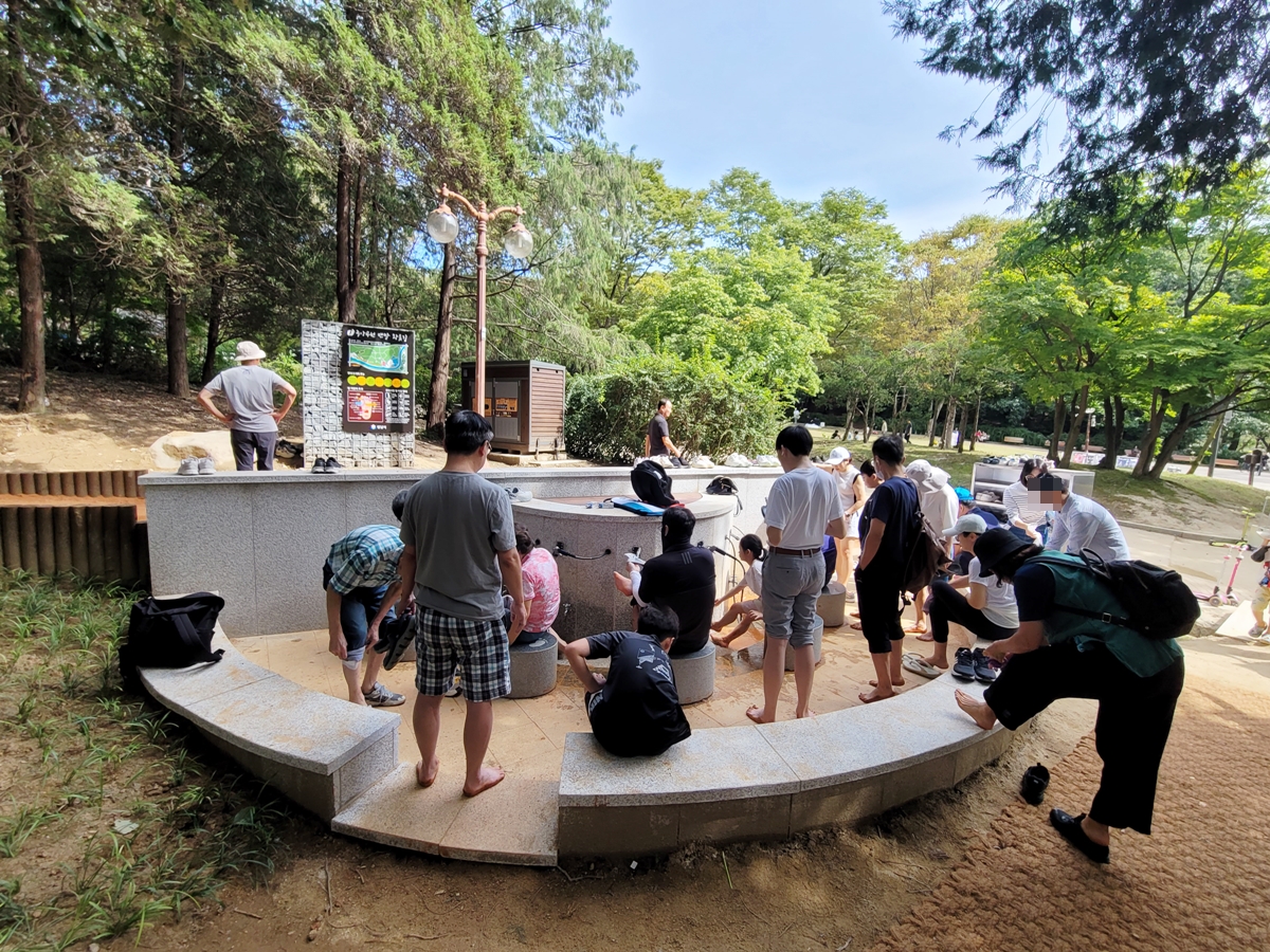 잔디광장 왼쪽에 9월 23일 개장한 중앙공원 맨발 황톳길이 있습니다. 여기도 입구에 많은 사람이 황톳길을 걸은 후에 발을 씻고 있습니다.